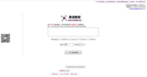 “微谱数据”提供五种碳谱数据查询方式:精确查询、模糊查询、深度查询、基团查询、不精确库查询,以及四种关键词检索:化合物名称、分子量、作者、植物名称属名或种名)