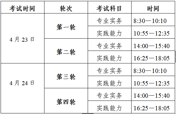 (二)考试时间:2022年4月23、24日两天,每半天为一个轮次,共分4轮次进行。考生将随机分配至其中一个轮次参加考试。具体安排如下: