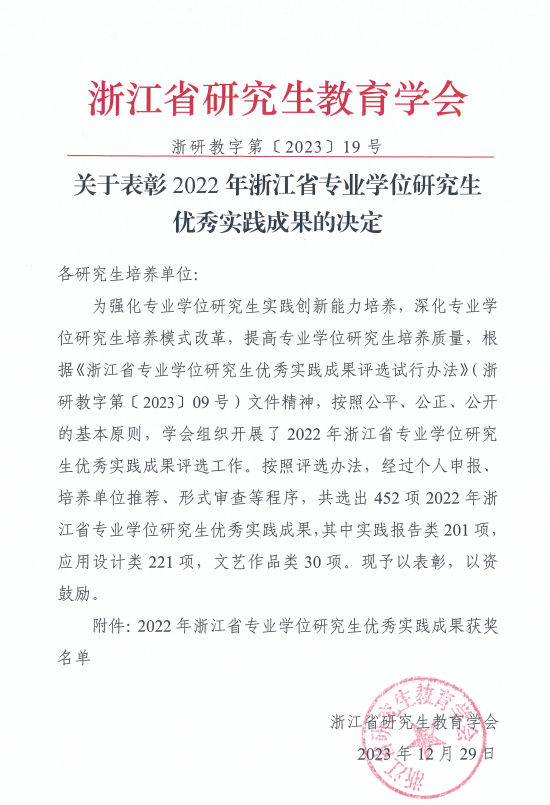 beat365英国官网网站3位专硕研究生相关成果获2022年浙江省专业学位研究生优秀实践成果!