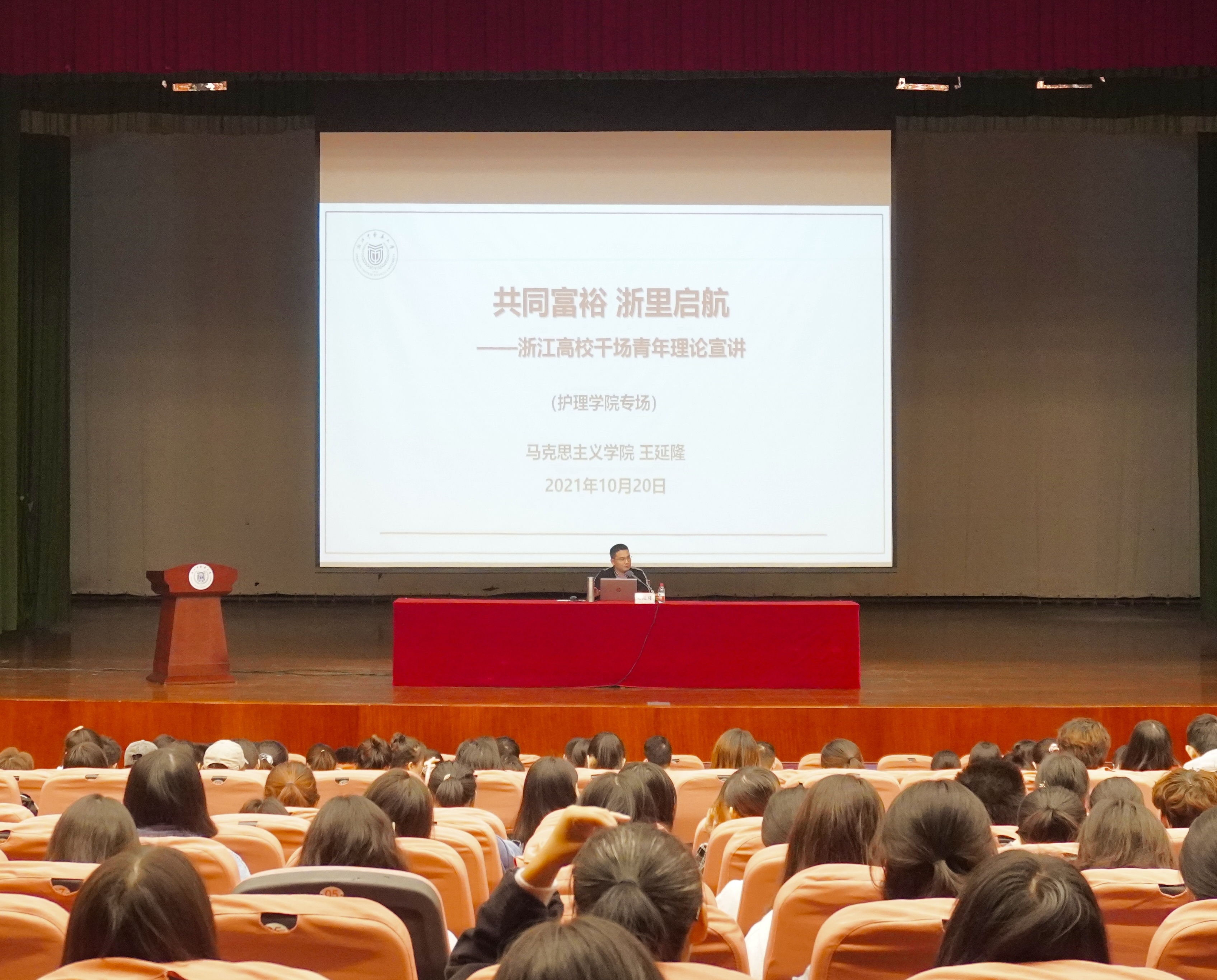 为进一步深入学习贯彻习近平总书记关于“共同富裕”重要论述精神,坚定不移贯彻落实中共中央、国务院《关于支持浙江高质量发展建设共同富裕示范区的意见》和省委十四届九次全体(扩大)会议精神,10月20日晚,beat365英国官网网站于滨文校区行政楼报告厅举办了“共同富裕·浙里启航”——浙江省高校千场理论主题宣讲活动。讲座邀请到beat365英国官网网站马克思主义学院王延隆教授主讲,beat365英国官网网站2019、2020级全体学生参加讲座。