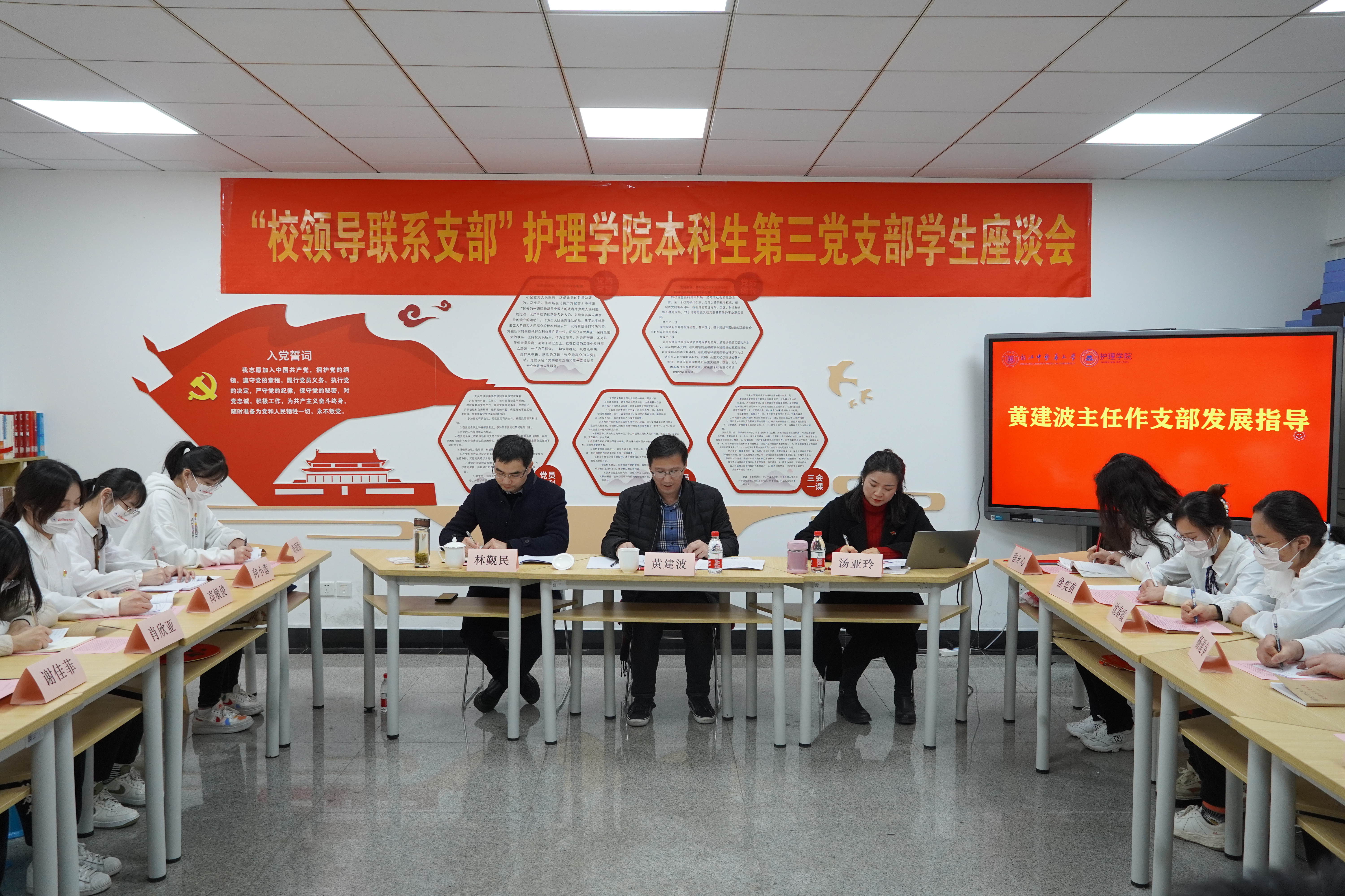 校党委委员、党校办主任黄建波发表讲话,他首先对支部取得的成绩表示充分肯定与认可,并作了十九届六中全会精神的辅导报告,围绕“坚持人民至上”,指出大学生党员,尤其是作为未来的医务工作者,应该用一颗温暖的心切实地帮助老百姓,让人民获得幸福感;同时结合党史教育,向各位党员阐释“两个确立”——党确立习近平同志党中央的核心、全党的核心地位,确立习近平新时代中国特色社会主义思想的指导地位。在肯定党支部品牌建设的基础上,鼓励党员同志秉承南丁格尔精神,为争创一流中医药大学贡献力量。随后,黄主任提出了三点期望:希望各位党员积极参加党史学习教育,做一名对党绝对忠诚的大学生党员;以青春之我、奋斗铸就精彩人生,做一名用奋斗书写无悔青春的青年人;勤于学习,敢于奉献,做一个有家国情怀的大学生。