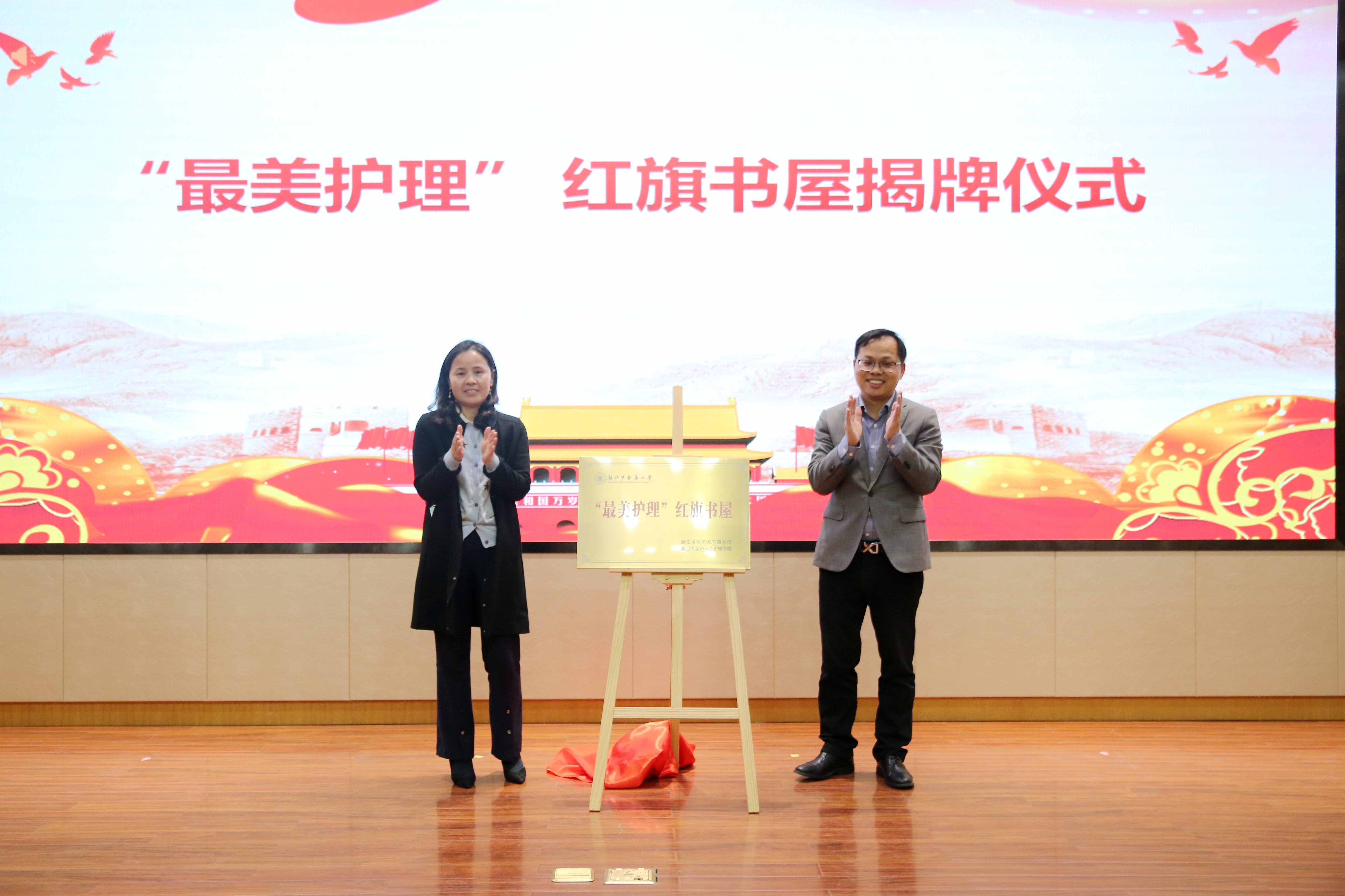会上进行了“最美护理”红旗书屋揭牌仪式。红旗书屋由图书馆提供借阅书籍,推出百种图书献礼建党百年。红旗书屋以读书漂流形式在学生中传递下去,并充分利用走廊、大厅等空间,创新借阅方式,优化借阅管理,积极创建泛在阅读环境,让学生随时随地都可以开展阅读,徜徉书海。
