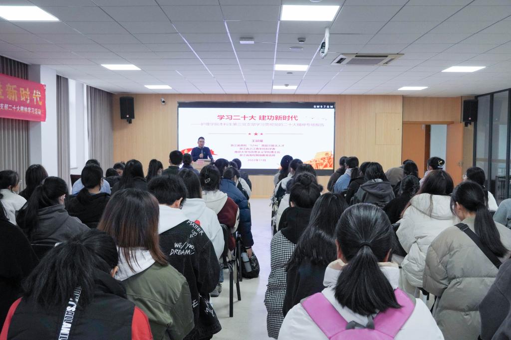为深入学习贯彻落实党的二十大精神,12月7日,beat365英国官网网站本科生第三党支部组织开展党课学习活动,邀请学校马克思主义学院副教授王延隆为支部全体成员上了一堂“学习二十大,建功新时代”的主题党课。