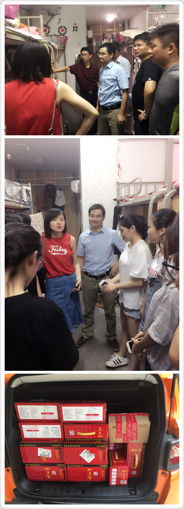 王部长、林书记一行深入学生宿舍,走访慰问学生,并给每一位留宿学生准备了凉茶饮料。林书记走到每一个空调的出风口,切身感受空调的制冷效果,并询问学生暑期留宿期间遇到的困难,鼓励学生干部、学生党员积极接纳没有安装空调的同学来纳凉避暑。同时,他叮嘱大家一定要保重身体,合理安排工作休息时间,做好防暑降温工作。
