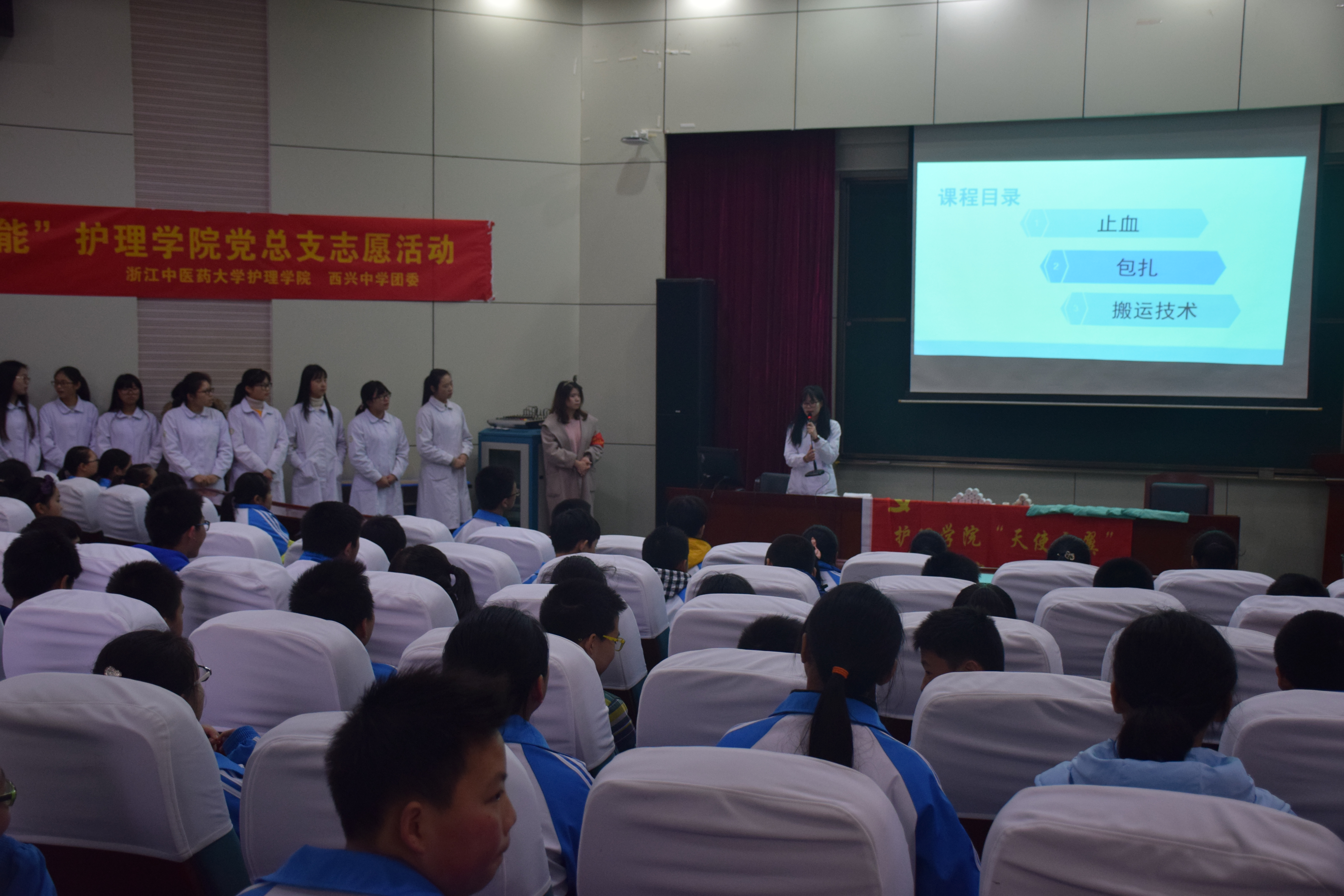 为了全面提升中学生安全意识,切实提高中学生急救技能,锻炼beat365学生专业技能。近日,beat365英国官网网站党总支组织党员之家义工服务队前往西兴中学开展以“扬党员风貌授救护技能”为主题的义工服务。共计300余名中学生参加了此次活动。