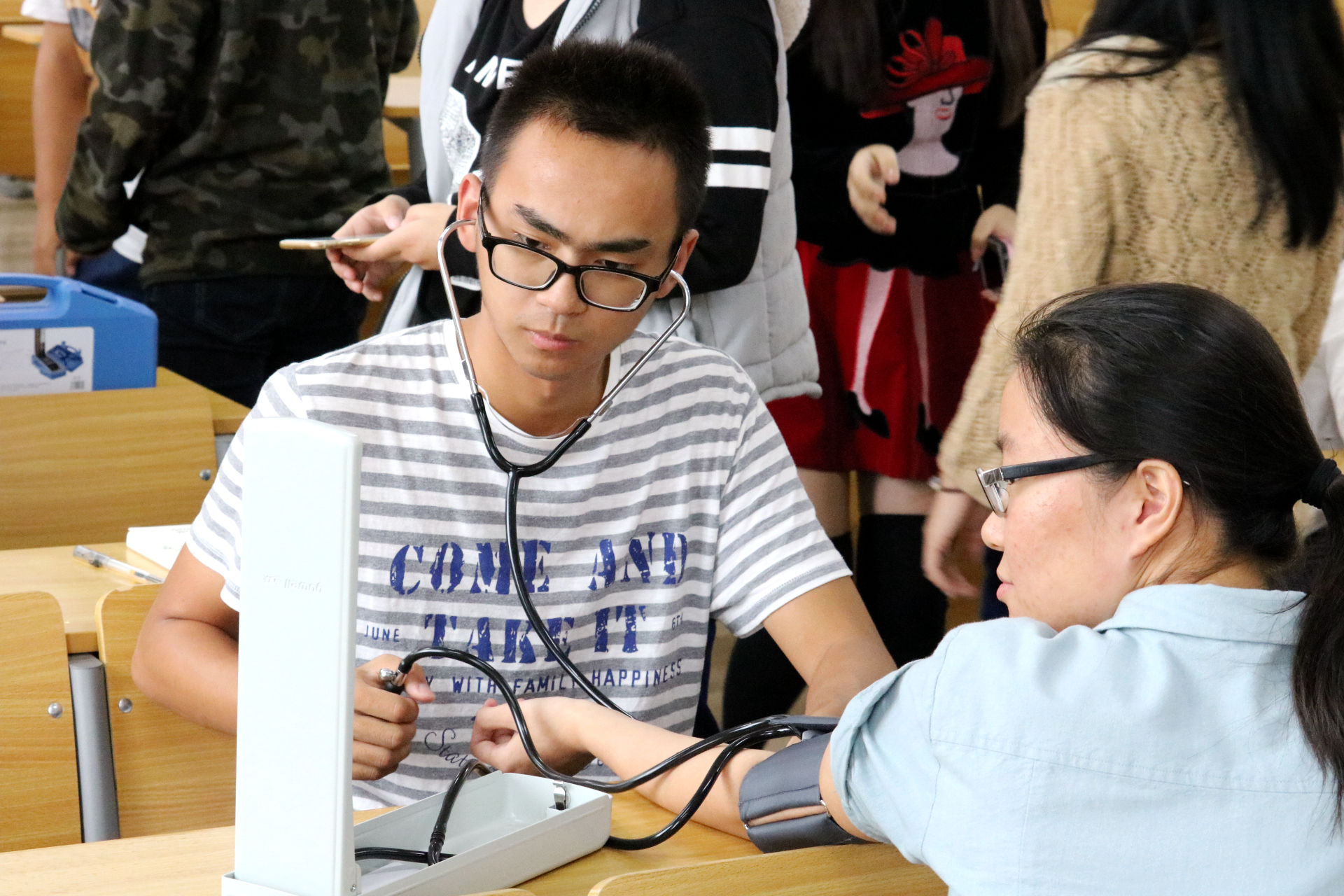 10月15日,为帮助新护生们掌握血压计的正确使用方法,丰富急救方面的知识,同时为今后的志愿服务工作打下扎实的基础,beat365英国官网网站志愿者协会在富春校区教学楼C401和C402举行“get血压新技能,开启志愿新篇章”血压培训活动。