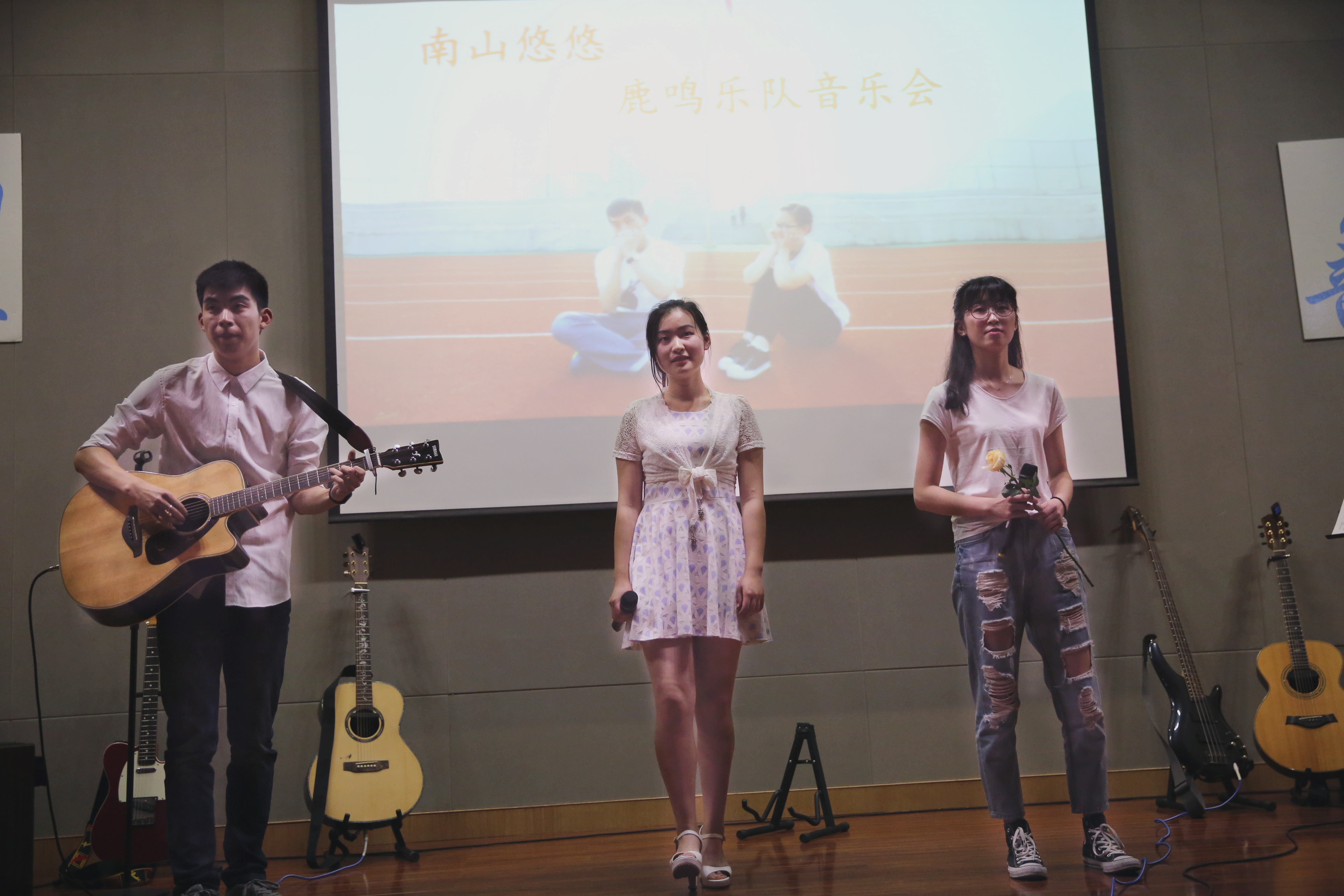 鹿鸣乐队由主唱姜飞宇、何颖,吉他手刘钊慧,鼓手王小娟等七人组成,每个人都各具特色。他们以大家耳熟能详的《风吹麦浪》作为开场秀,七个俊男靓女拿着吉他、打着鼓,站在那儿就能感受到那袭面而来的清纯与活力。紧接着的《喵小姐》、《给我一个吻》、《uptown funk》、《贝加尔湖畔》等曲目将现场的气氛带向一个又一个高潮。乐队指导老师熊起洪老师(百度原创音乐人,豆瓣原创音乐人,杭州知名吉他教师,杭州指弹吉他演奏家,杭州原创音乐人)也带领他的上禾音乐乐队一展歌喉,一曲《南山南》仿佛是在诉说一个故事,一段与中医药的不解情缘,全场观众热情高涨,全身心投入享受音乐。最后,在袅袅乐音中鹿鸣音乐会落下帷幕。