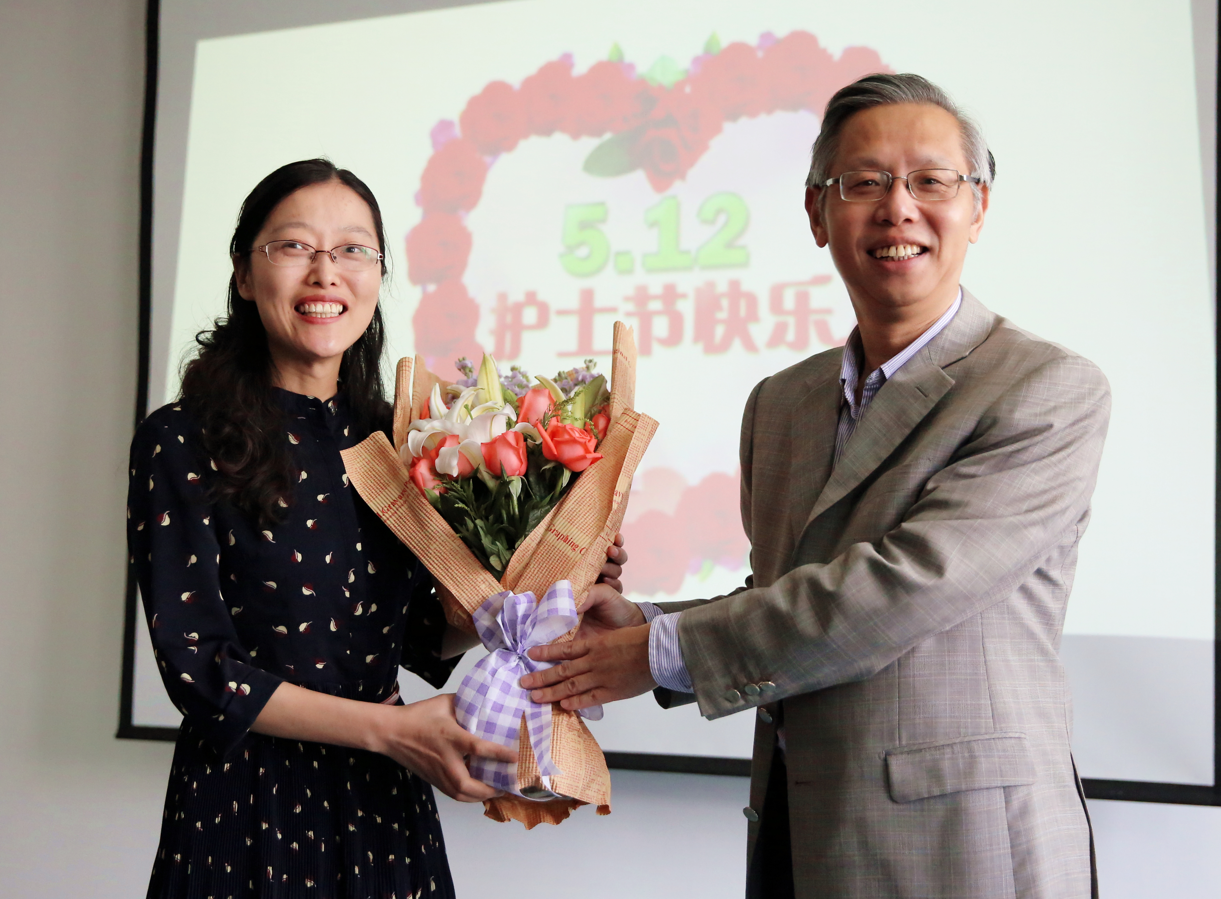学院杨莉莉老师作为教师代表接受了鲜花,方校长说要把鲜花送给杨老师有三层含义,首先要对杨莉莉老师表示祝贺,在她本人的努力下,成为我校首位培养的中西医结合护理博士。其次杨老师有多年的临床工作经验,勤勤恳恳在一线护理岗位上做出了自己的努力。最后杨老师现在在beat365英国官网网站的专业教师,beat365英国官网网站是培养未来护士的摇篮。学院要继续努力做好学科建设及人才培养,其责任重大,意义深远。