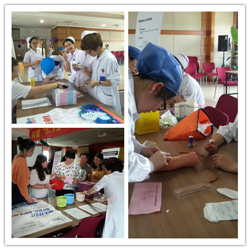 为了让大家度过一个欢乐和谐而富特殊意义的节日,5月11日至13日,护理部组织开展了寓教于乐的体验式学习活动——“静疗游园活动”。此项活动融知识性、科学性、趣味性于一体,包括了“知识竞赛”、“我是好球手”、“我是穿刺小能手”和“一起来找茬”四个环节。“你答对了,真厉害,顺利进入下一关”“你抽中的是胰岛素,你认为应该选择什么方式,钢针、深静脉还是外周静脉?”“来,擦亮你的眼睛,看看这张照片,你觉得有哪些地方是做得不到位的呢?”“加油,加油!越过最后一个关卡,闯关成功!”要是答错了或是操作中存在问题,还有护士长或静疗组成员现场指正。每个项目区都充满了欢声笑语,游园活动现场成了一片欢乐的海洋,阵阵加油声、喝彩声、笑声将游园活动的欢乐气氛不断推向高潮。大家纷纷表示非常喜欢此类活动,趣味盎然的游园活动让她们在紧张的工作之余放松了心情,娱乐了身心,更让她们感受到关爱和大家庭的温暖。分管护理的张弘副院长和陈华副书记在百忙之中亲临现场,给护士们增添了支持力量。