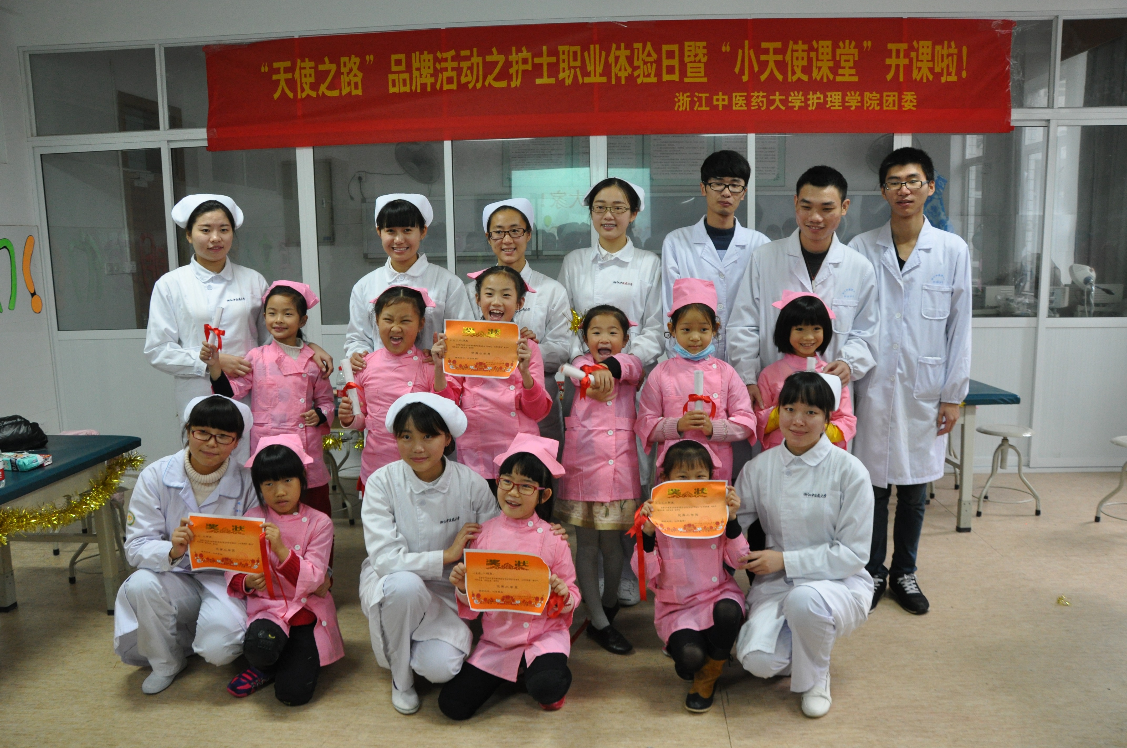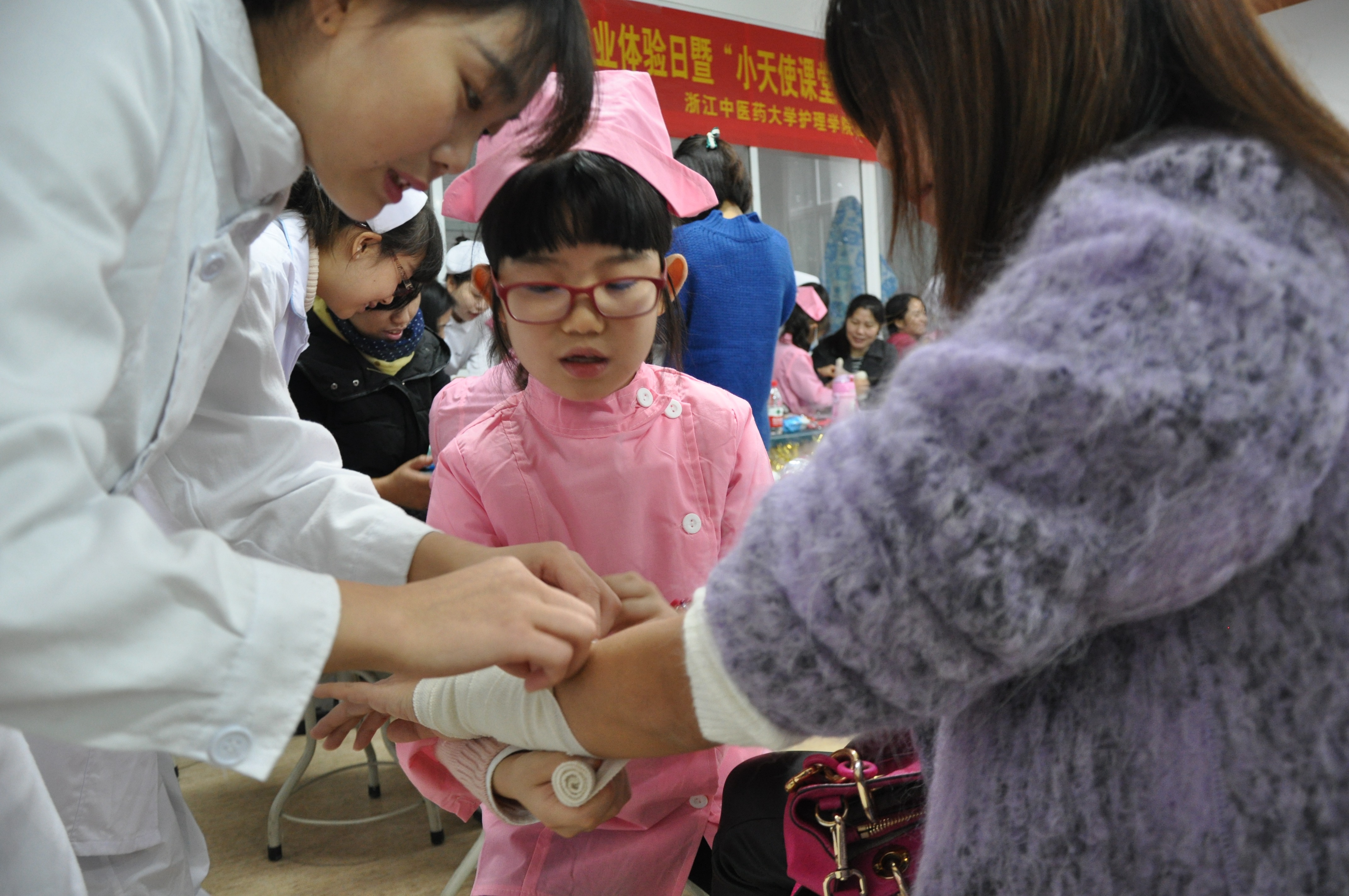 深秋之时,微雨霏霏。11月21日上午,beat365英国官网网站在21208教室再次开启护士职业体验日之“小天使课堂”活动。活动以“天使之心,呵护淳淳童心”为主题,旨在通过寓教于乐的方式,开展面向小学生的护士职业体验活动,让小朋友们在游戏和操作的过程中,了解医疗常识,感受中医护理。本次活动面向杭州市滨文小学二年级学生及家长开展。