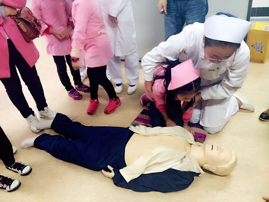 “小天使课堂”活动开始,主持人以“我是小护士”引开,用护士的服饰激发小朋友们的兴趣,并通过分发小奖品的方式鼓励小朋友们积极参与课堂。积极踊跃的参与,很快让每一位小朋友都得到一份与众不同的奖励——“小小护士服”。粉红色的护士服,俏皮可爱的护士帽,换上护士服的小朋友们显得精神奕奕俨然一个个真正的小护士。接着通过情景表演、新闻引入等,为小朋友们引入止血包扎、CPR急救操作等教学内容。9名衣着整齐的准护士们担任此次课堂的小老师,为小朋友们和家长们一一教学,指导专业的医疗知识和急救操作。同时,也鼓励小朋友们走上讲台,为大家进行演示。作为具有中医特色的护理学专业,耳穴压窦的中医护理操作技术也是此次的重点教学内容。在小老师们的指导下,小朋友们亲手为家长们进行运耳、探穴、点压等专业操作。