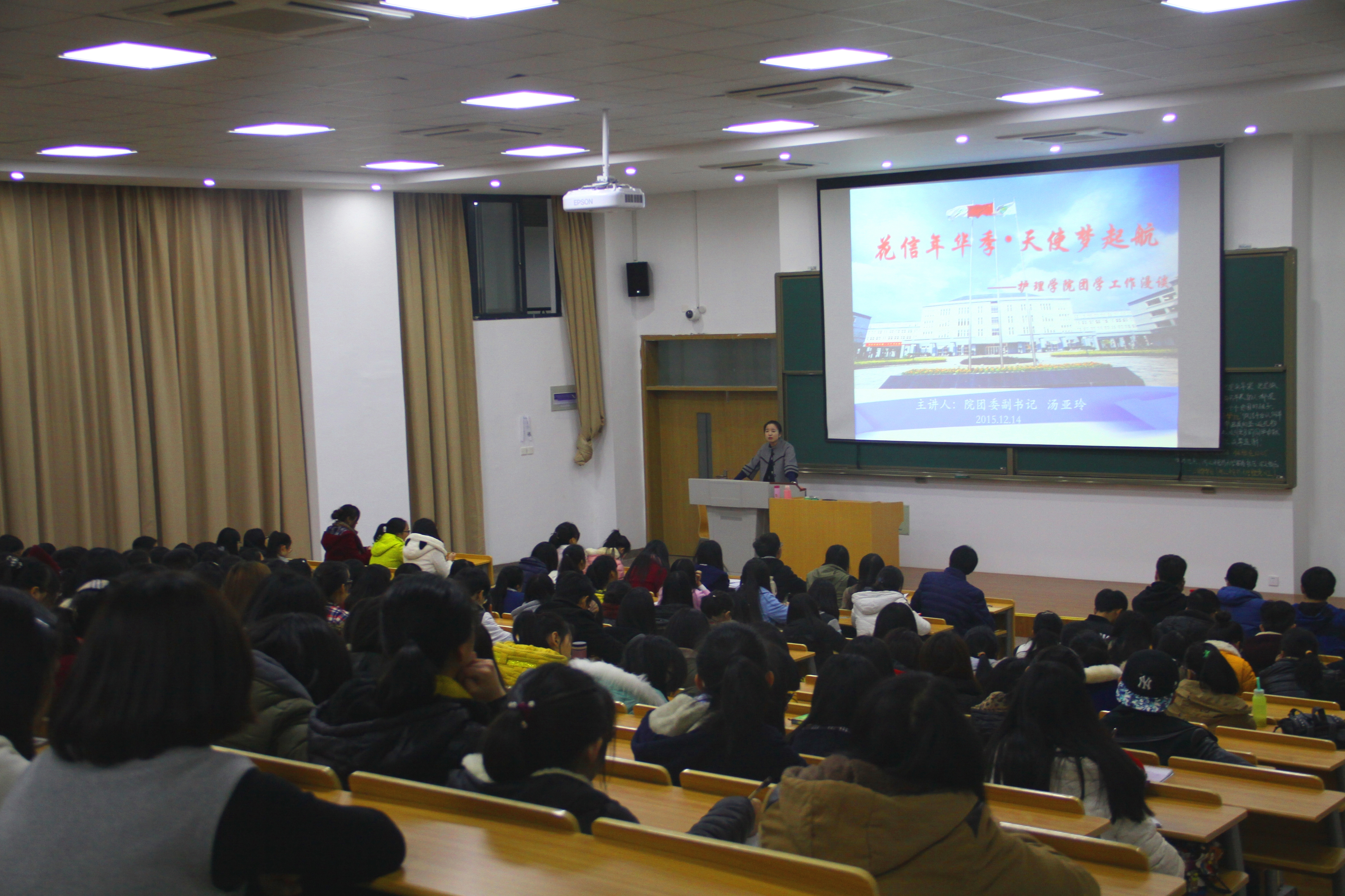 讲座由学院团委副书记汤亚玲老师主讲,以“馨情天地”、“花信年华”与“天使起航”三个模块,围绕学院团学组织架构、品牌活动展示与团学干部培养等内容展开讲解。在熟悉现行学院团学组织架构、部门建设的基础上,以“天使之路”与“女生节”两大品牌活动为依托,加深新干事对学院团学工作的认识与了解。同时,具体讲述学院对团学干部的培养与考核方案,让每一位干事明确工作规范、明晰个人发展。汤老师希望通过组织干事培训,促进老干事更杰出地开展工作,不断提升工作能力与效率;同时勉励新干事要有目标地进行团学工作,敢于表达自己的看法,为团学组织建设贡献自己最大的力量。最后汤老师对新老干事们提出希望,希望他们能够通过“慕贤学堂”获得成长,严格规范要求自己,弥补短处、发扬长处,为各自部门献力献计,共同取得进步。此次活动取得了圆满成功,在一阵阵雷鸣般的掌声与一双双期待的眼神下顺利落下帷幕。