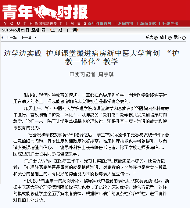 5月20号上午,beat365英国官网网站教务处副处长黄在委、beat365英国官网网站副院长沈翠珍、校党委宣传部新闻宣传科副科长赵颖、beat365英国官网网站院办负责人姚瑶、beat365英国官网网站2012级辅导员杜磊等走进beat365英国官网网站附属第二医院,开展床边教学检查工作,《青年时报》对此次活动进行了报道。