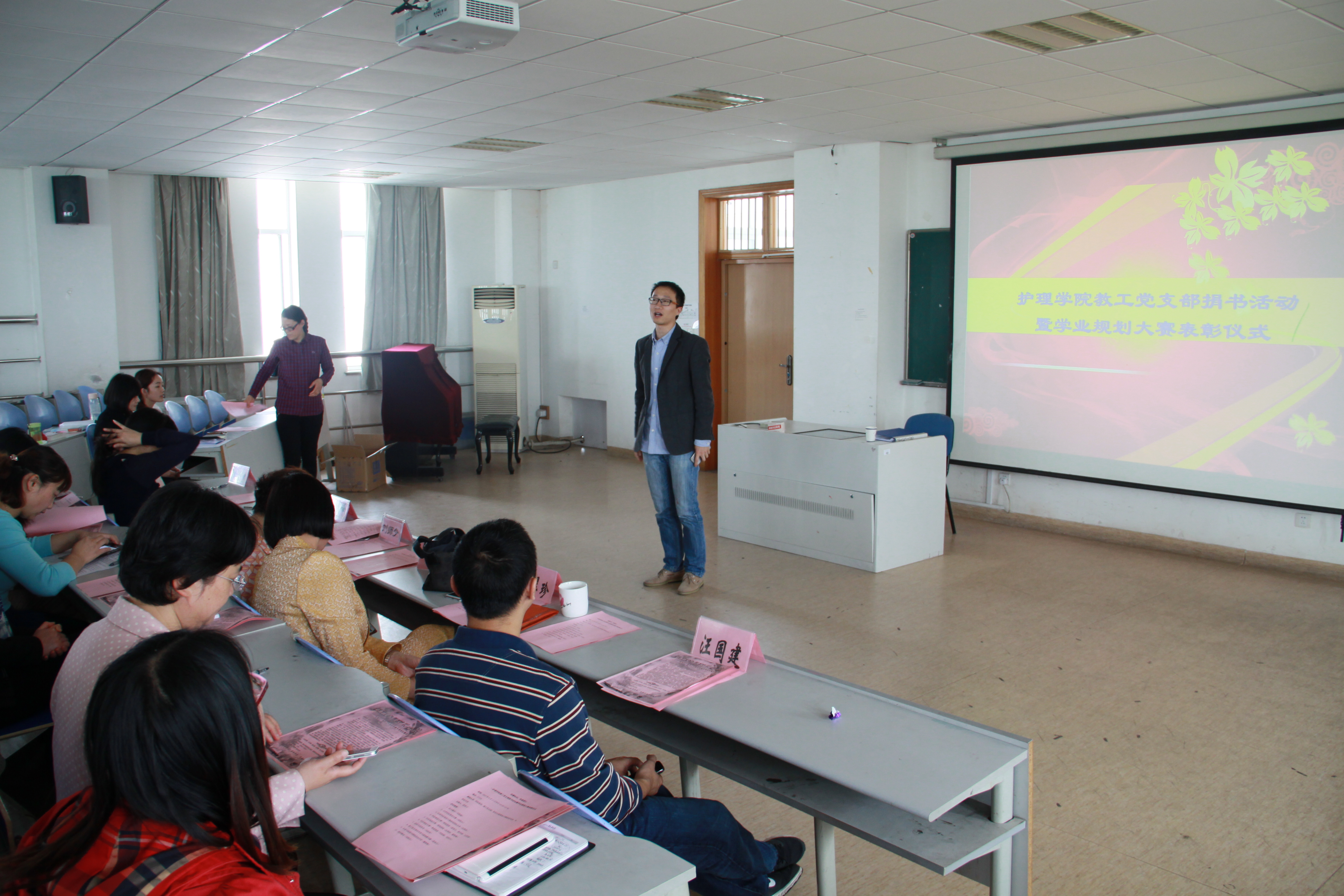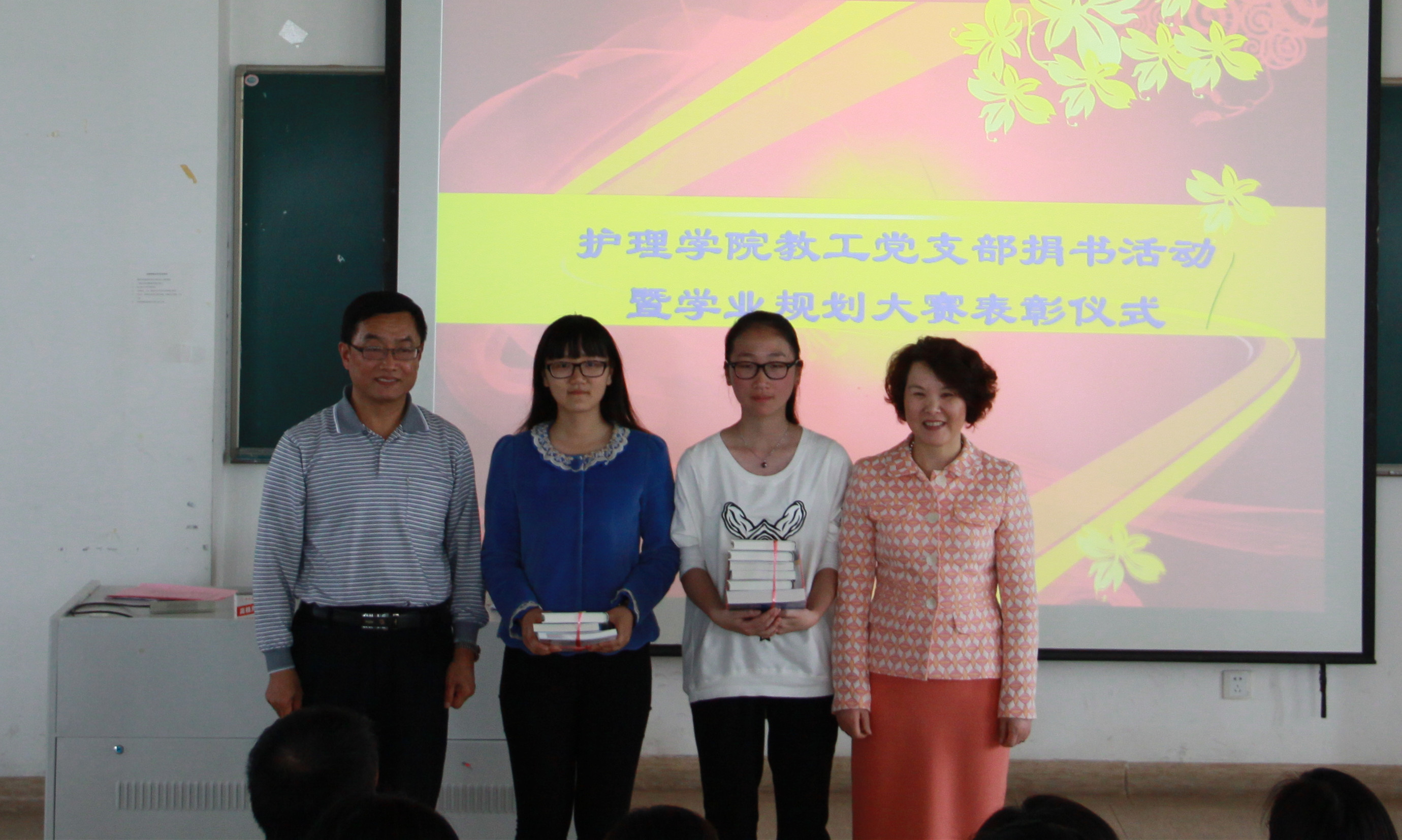 2015年4月17日中午,在beat365英国官网网站21518房间召开了教工党支部捐书活动暨学业规划大赛表彰仪式,学院全体党政领导、教工党支部老师、学业规划大赛获奖代表、冬青社代表参加了本次会议。