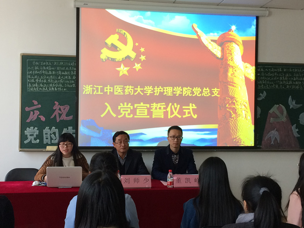 学院党总支副书记刘师少对活动进行了高度赞扬并对新发展的党员提出了几点期望和要求:第一,加强党性修养,提高自身素质;第二,具备成为一名优秀的护士所应该有的清晰思路以及技术与技能的完美结合;第三,无论在校园学习阶段,还是在即将面临的实习阶段以及在将来的临床工作阶段都要起模范带头作用。之后,由学院党总支副书记董凯峰老师宣布了参加本次宣誓的新发展党员名单。两位领导为新发展党员颁发了“入党通知书”,恭喜她们加入了中国共产党。新发展党员代表、正式党员代表、入党积极分子代表依次发言。接下来,在领誓人的带领下, 21名新发展党员面对党旗宣誓,表明了她们遵守誓词各项内容的决心,以及对党组织和党的事业承担的政治责任。最后,宣誓仪式在全体新发展党员嘹亮的国歌声中圆满落幕。