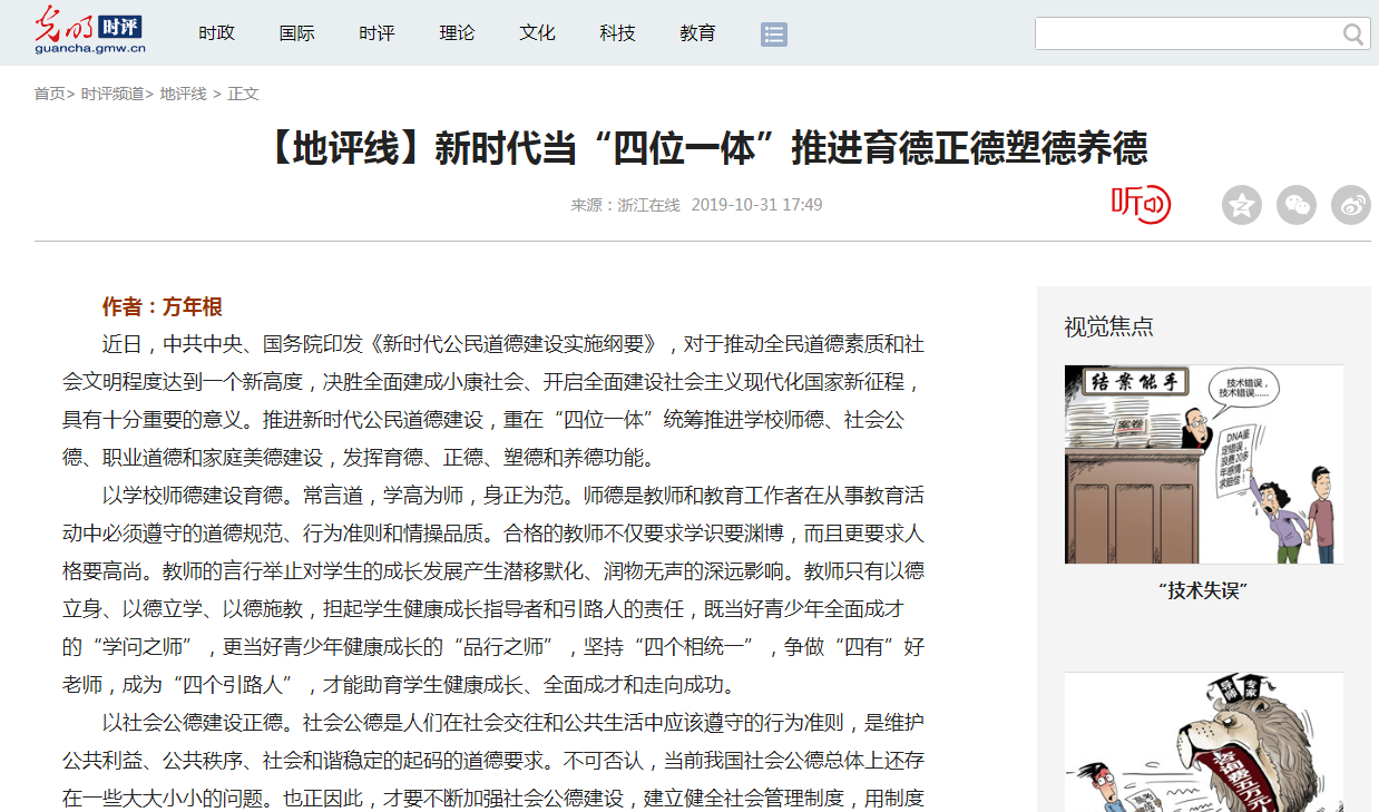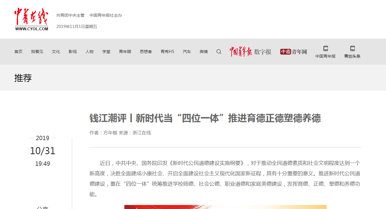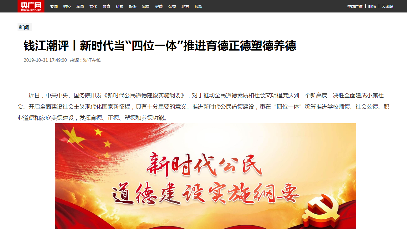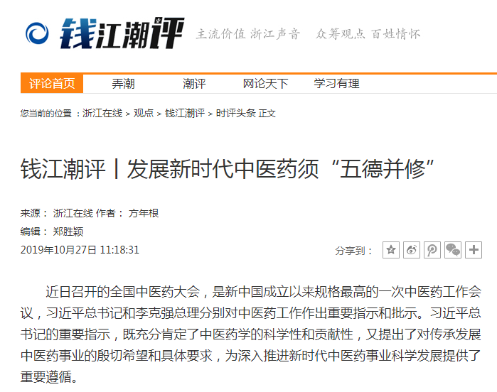 在理论学习过程中,大家做到以学促思、学思结合,积极撰写心得体会、学习文章,认真准备专题党课讲稿,集中研讨交流学习体会,有的学习文章还被有关报刊和网站刊登。beat365党总支书记方年根在认真学习、调查研究、深入思考的基础上,撰写了多篇学习文章,其中《用“六神有主”检验主题教育学习成效》一文刊发在2019年11月1日的《中国中医药报》;《发展新时代中医药须“五德并修”》和《新时代当“四位一体”推进育德正德塑德养德》两篇文章先后被《浙江在线》“钱江潮评”栏目刊登。特别是《新时代当“四位一体”推进育德正德塑德养德》一文,被全网转载,截至目前已被《央广网》《光明网》《中青在线》《中国经济网》《国际在线》等网站转载40余次。
