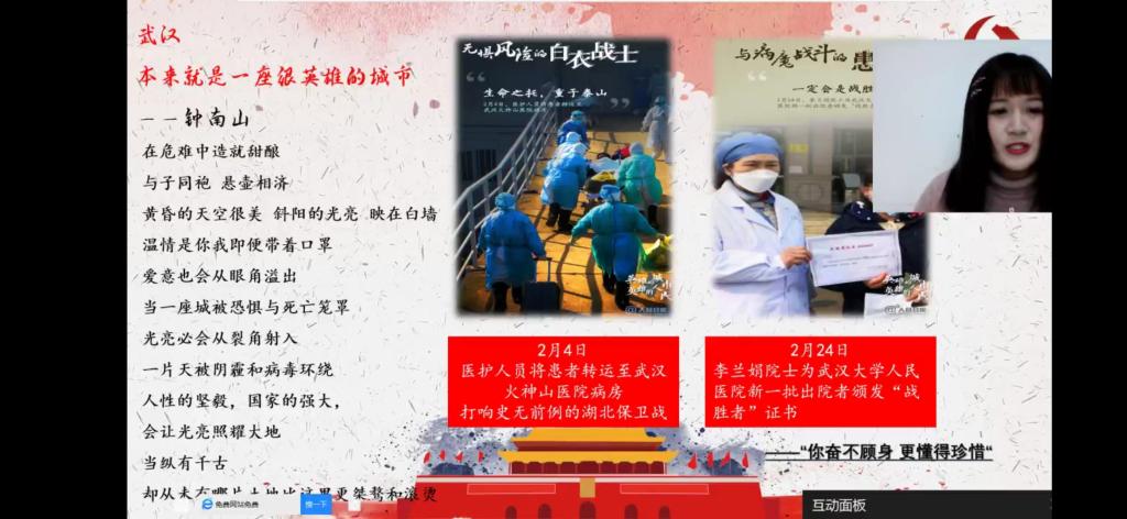 此次活动分三个阶段进行。前期,各党支部通过自愿报名和选拔,推荐了12名党员组建成立了宣讲团。接着,宣讲团成员结合本次抗疫涌现出来的典型人物事迹和身边同学积极投身抗疫志愿服务经历,制作了ppt。最后,各党支部组织全体党员和入党积极分子参加视频会议,聆听党员宣讲,并进行了学习交流。