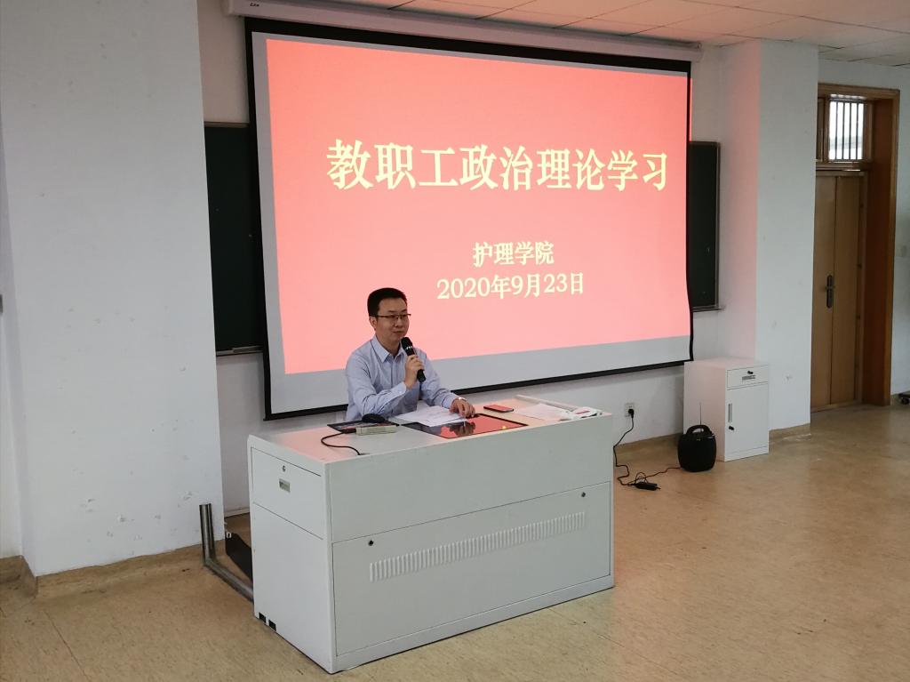 9月23日下午,beat365英国官网网站党总支在21518教室举行新学期首次教职工政治理论学习,学院全体教职员工参加。学习会由学院党总支书记方年根主持。本次政治理论学习的主要目标是“以‘学’强‘神’”,这个“神”就是凝聚着工作作风、师德师风、医德医风和院风学风的“情怀、使命和品牌”。学习活动继续坚持学院“五不五有”教职工政治理论学习模式,突出彰显三大特点: