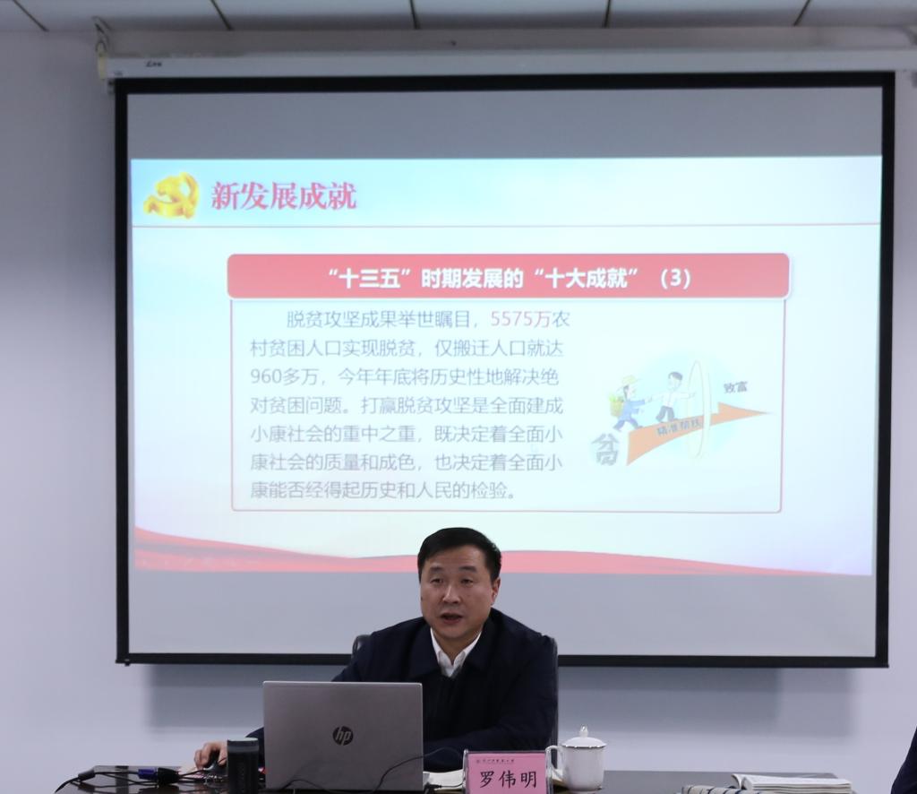 罗伟明副校长指出,党的十九届五中全会是我们党在全面建成小康社会胜利在望、全面建设社会主义现代化国家新征程即将开启的重要历史时刻召开的一次十分重要的会议,是在我国进入新发展阶段、实现中华民族伟大复兴正处于关键时期召开的一次具有全局性、历史性意义的会议。他强调,学习领会好党的十九届五中全会精神,一要深刻把握新发展成就,切实增强民族自信心自豪感。二要深刻把握新发展阶段,锚定我国发展的历史坐标。三要深刻把握新发展目标,更加勠力同心奋勇前进。四要深刻把握新发展指南,明确社会主义现代化方向。五要深刻把握新发展任务,坚定不移推动高质量发展。六要深刻把握新发展格局,把握主动下好先手棋。七要深刻把握新发展保证,确保规划目标如期实现。此外,他在充分肯定beat365英国官网网站近年来的工作成绩基础上,结合高质量推进beat365英国官网网站发展要求,从坚持学习常态化制度化,使学习成为一种习惯;坚持学习大众化多样化,使学习成为一种趣味;坚持学习系统化研究化,使学习成为一种能力等三个方面对学院理论学习与教学工作提出了建议。从强学科汇聚人才、强专业改善条件、强管理提升服务、强党建争创一流等四个方面对学院编制好“十四五”规划提出了指导性意见。