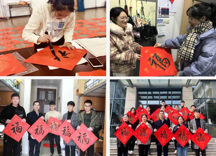 为了开展好“写福字送祝福”活动,学院特意联系安徽宣城宣纸工艺厂,量身定制印有院训“博爱、博学、精诚、精进”字样的泥金斗方。学院师生利用课余时间,挥毫泼墨创作了400余副作品,并奔赴学生寝室将福字送到学生手上,将这饱含着浓浓的新年祝福张贴到每一个寝室。
