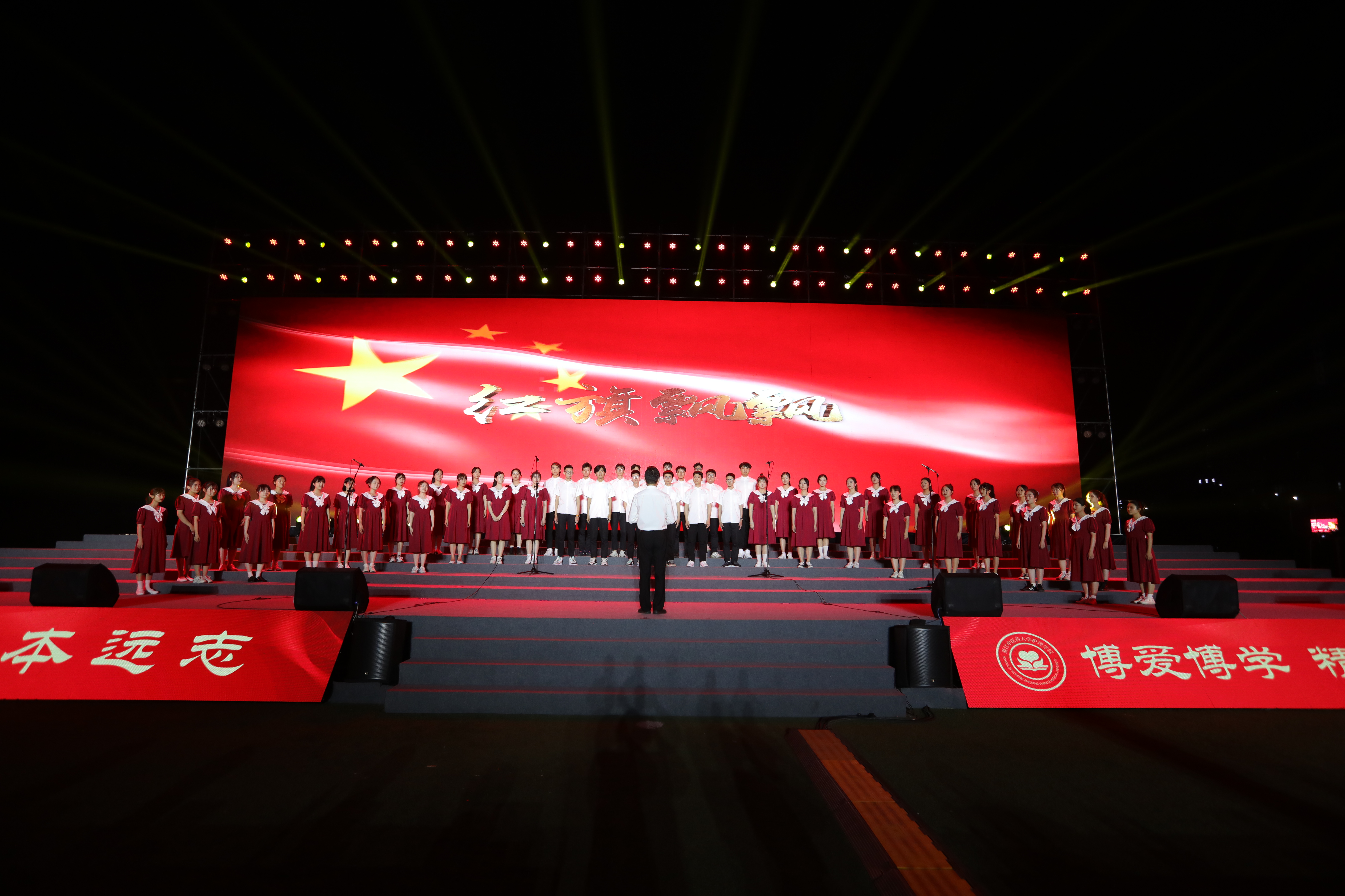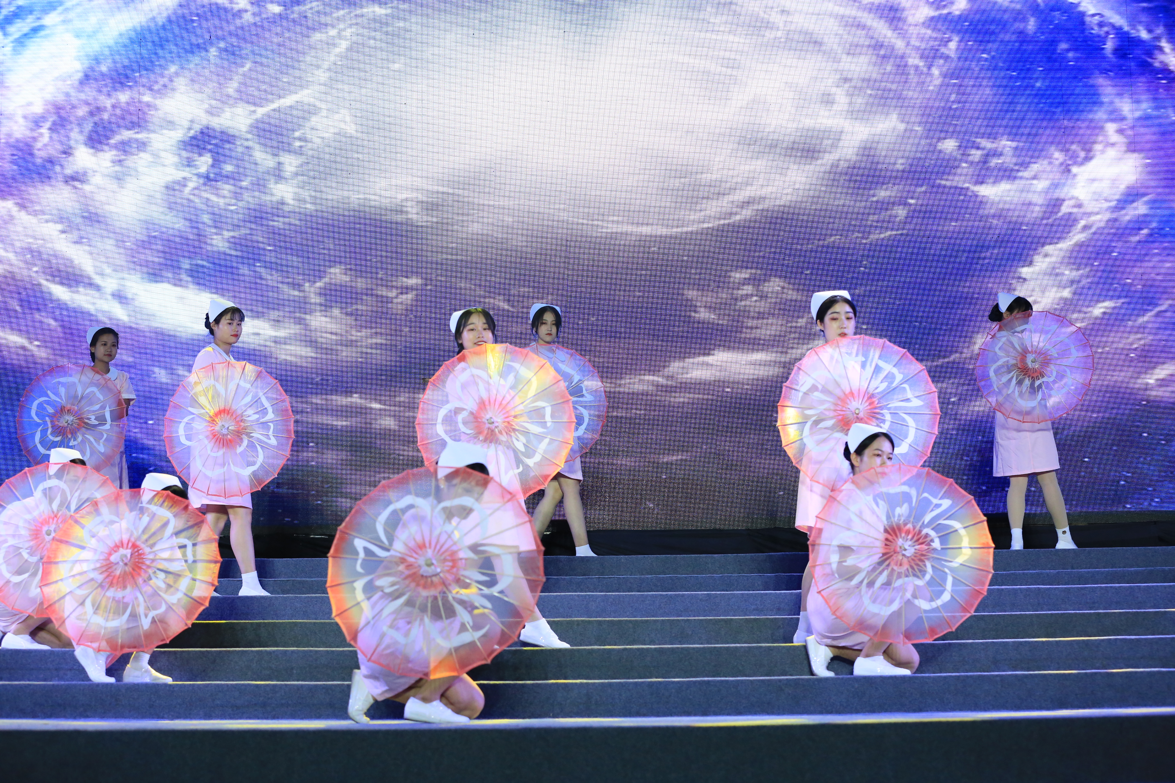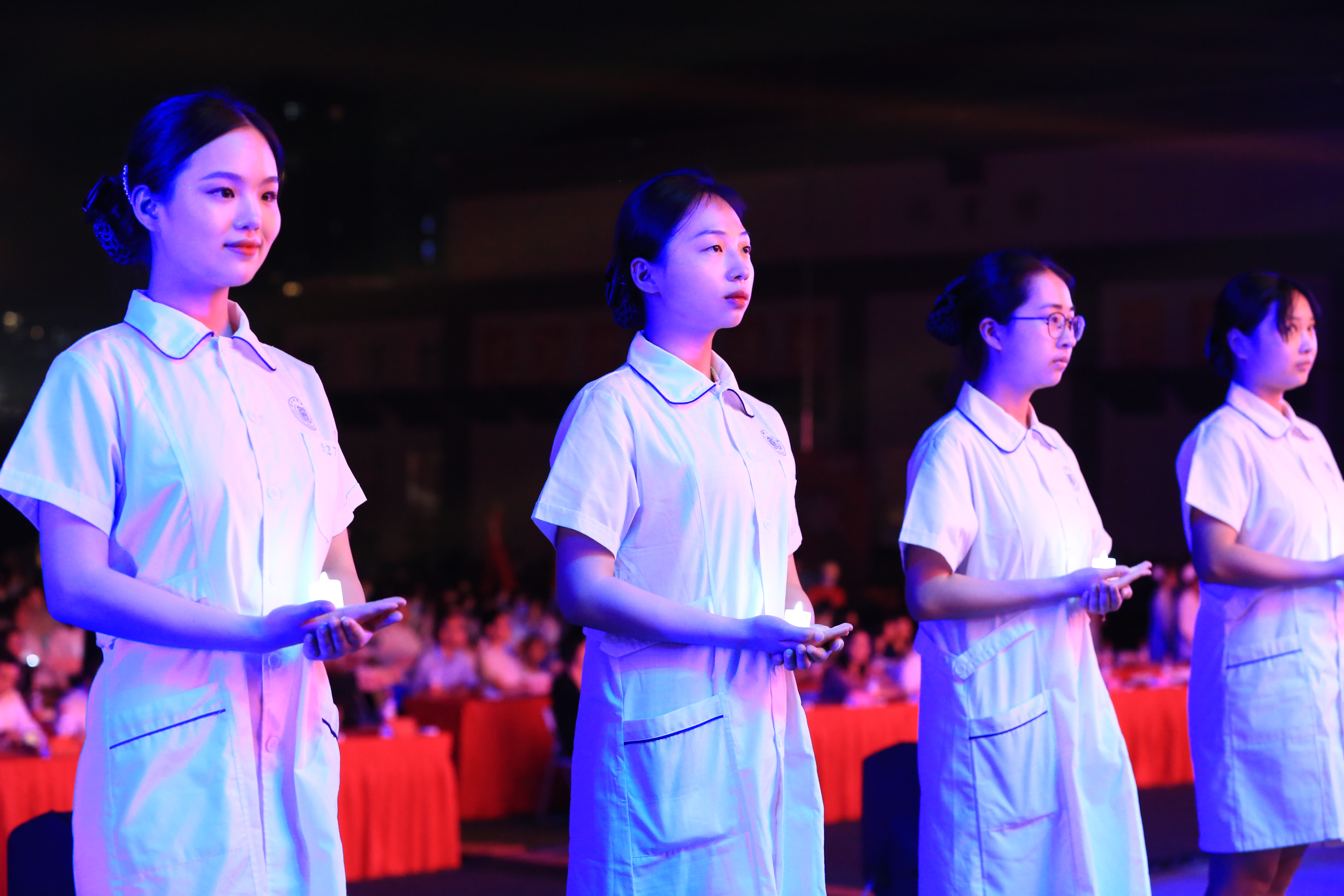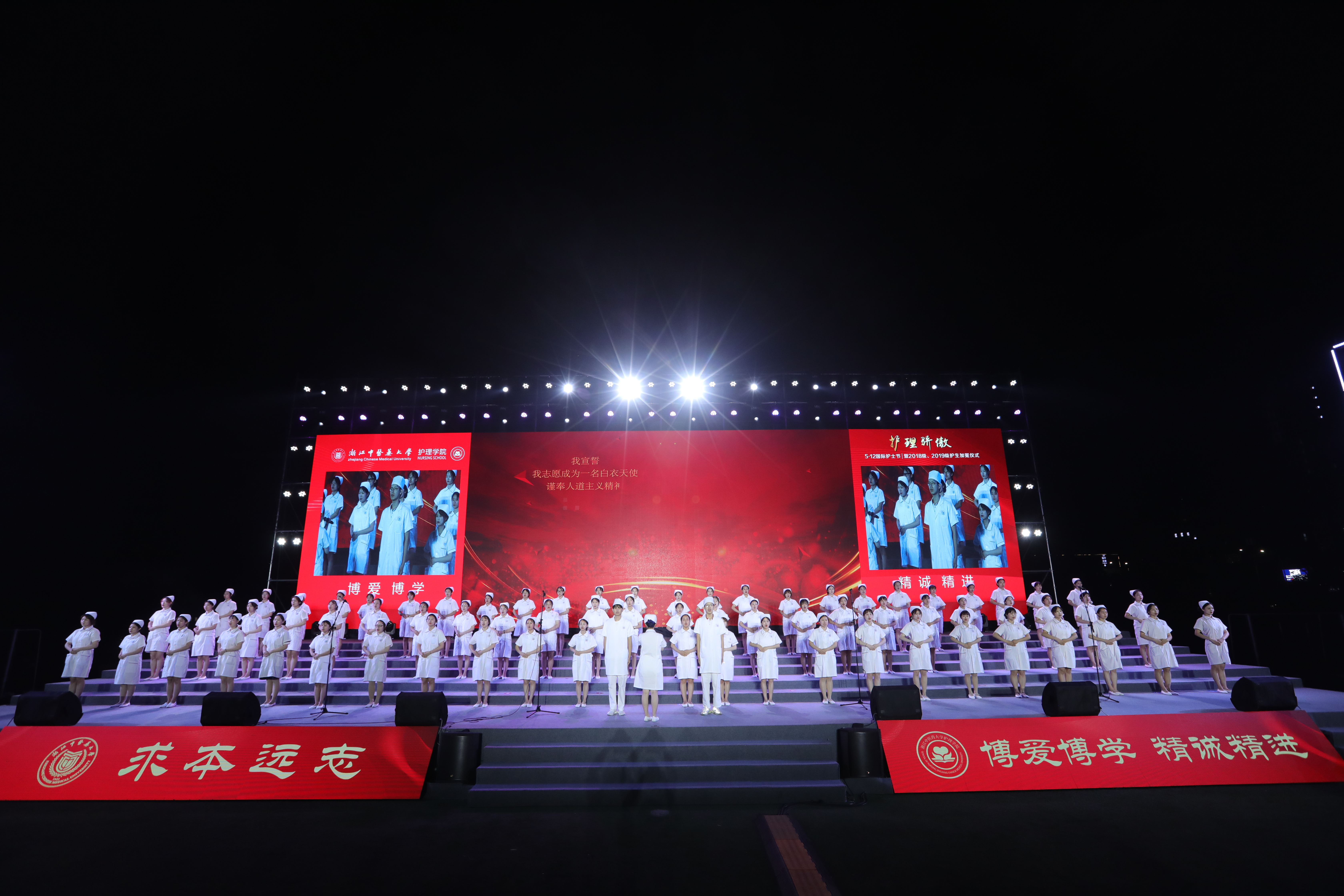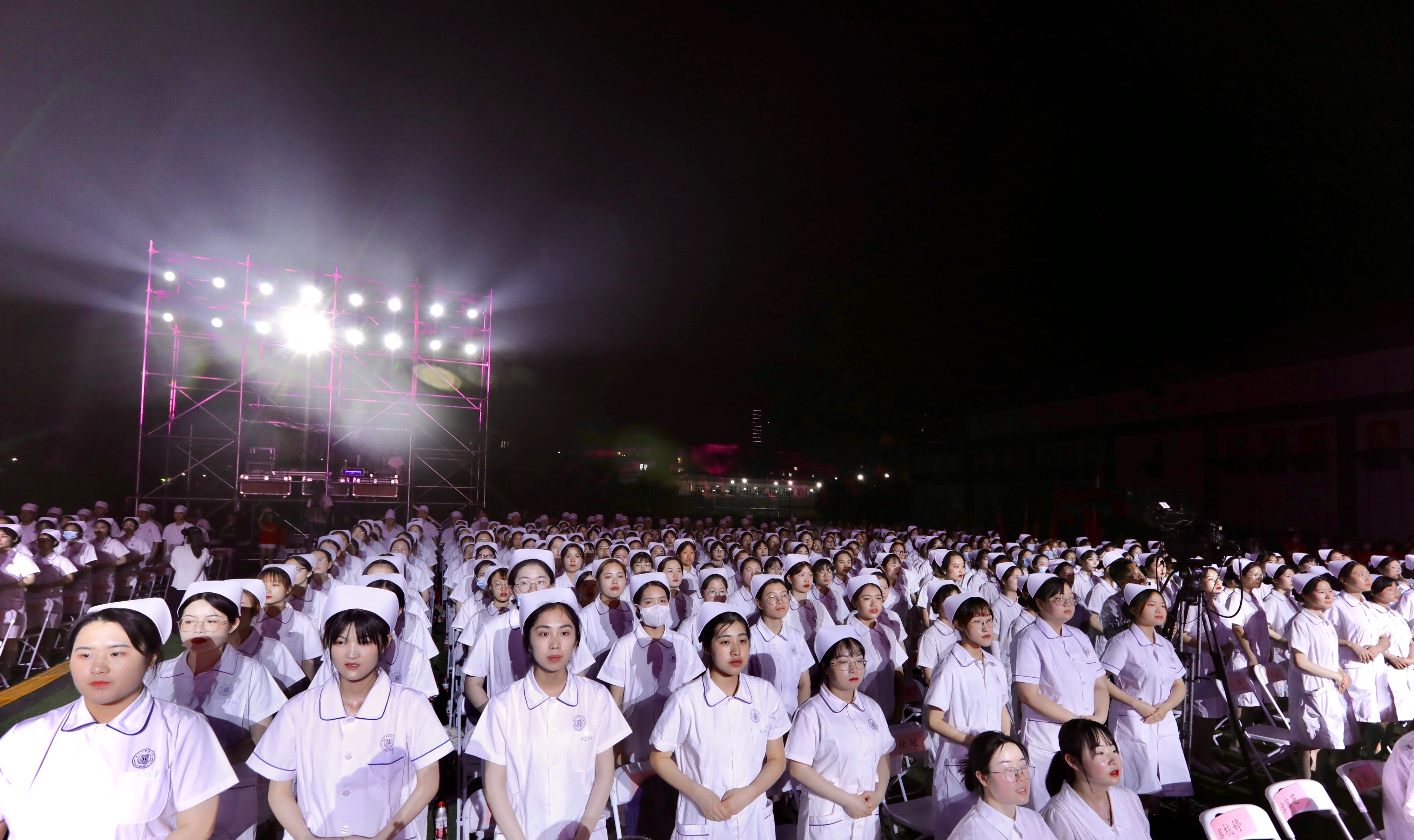 颁奖环节结束后,伴着神圣的背景音,100位护生身着白色护士装,面带微笑,手捧红烛灯迤逦而出,象征着点燃生命之灯。随后,630位参与授帽的同学分批入场,由护理前辈为其加冕。“我宣誓,我志愿成为一名白衣天使,谨奉人道主义精神,坚守救死扶伤信念,履行保护生命、促进健康、减轻病痛的职责,遵守护士职业道德规范,永葆白衣天使圣洁……把毕生精力献给护理事业。”在朗朗誓词中,新生代护理人接过前辈手中的蜡烛,加入白衣天使的行列,也象征着同学们献身护理事业的决心。在舞蹈《逆行天使》和合唱《红旗飘飘》中,活动落下帷幕。