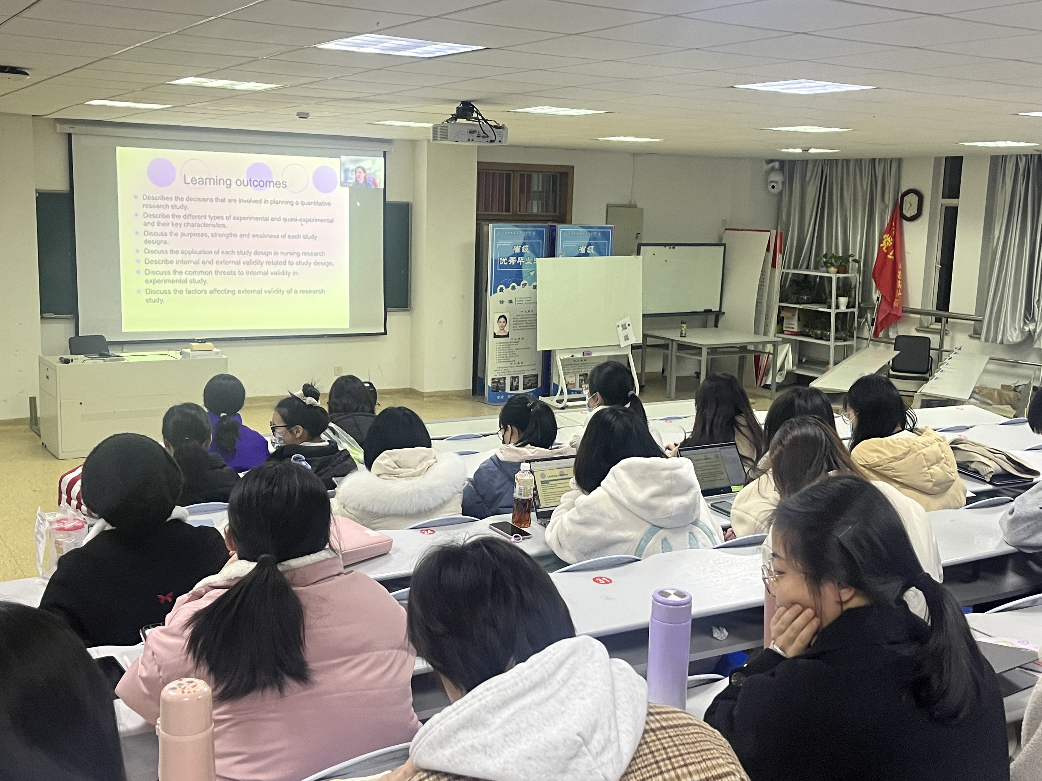 余秀凤教授以“Rsearch design: experimental study”为题,通过全英文授课,分别从实验性研究、类实验性研究的特征、设计、优缺点及在护理研究中的应用、研究设计的效度问题等几个方面展开讲解,开阔了学生的科研设计思维。