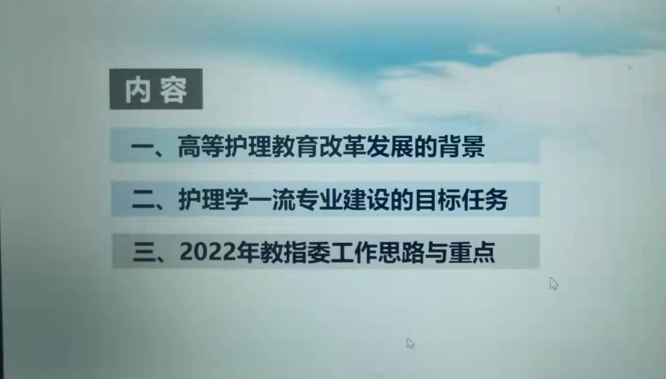 会上,孙秋华主委介绍了新一届教指委成员的组成,总结了上一届教指委的工作,组织学习教育部有关医学教育创新发展的会议文件精神以及教育部高等学校护理学类教指委年度工作会议精神,并作了题为“聚合力、强内涵、谋发展,推动高等护理教育高质量发展”的主题报告,对本届教指委2022年工作要点做了部署,也提出了希望。