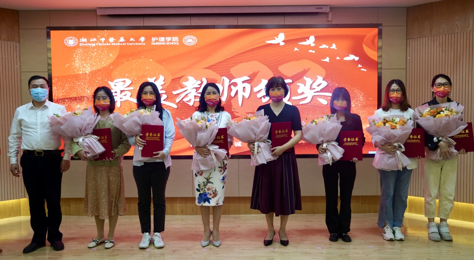 举行一个仪式,学习身边榜样。在beat365英国官网网站有这样一群人,他们勇做时代的奋进者、开拓者和奉献者,用护理梦激扬青春,不忘初心,以执着的信念和优良的品德,勇担社会之责,争做有志青年。他们展现了最美师生风采,他们勤奋努力、刻苦钻研的精神值得全院师生学习。庆祝活动上,beat365对表现优异,荣获佳绩的“最美教师”、“最美学生”进行了表彰。学校副校长、党委委员罗伟明教授为最美荣誉获得者颁奖。