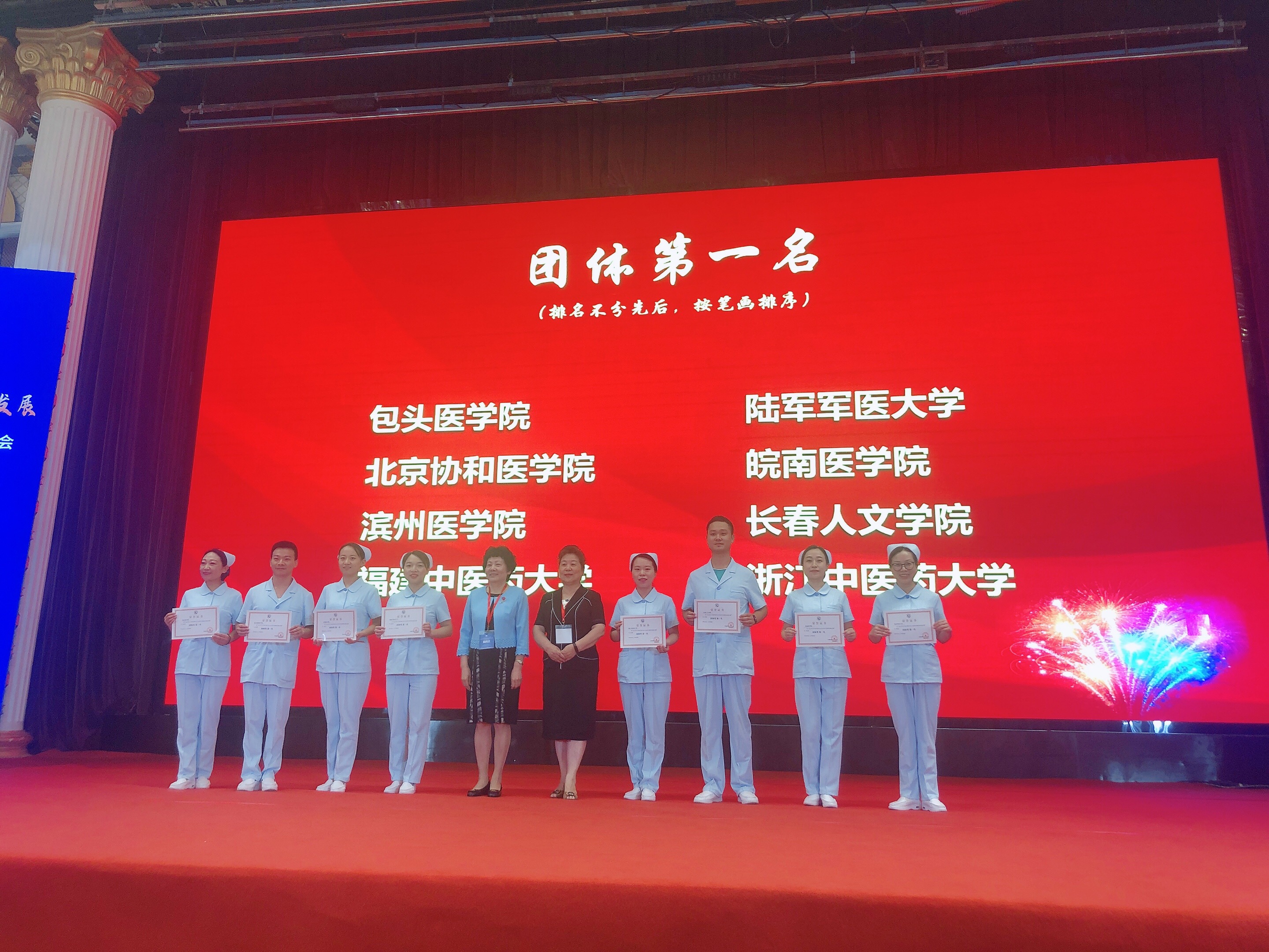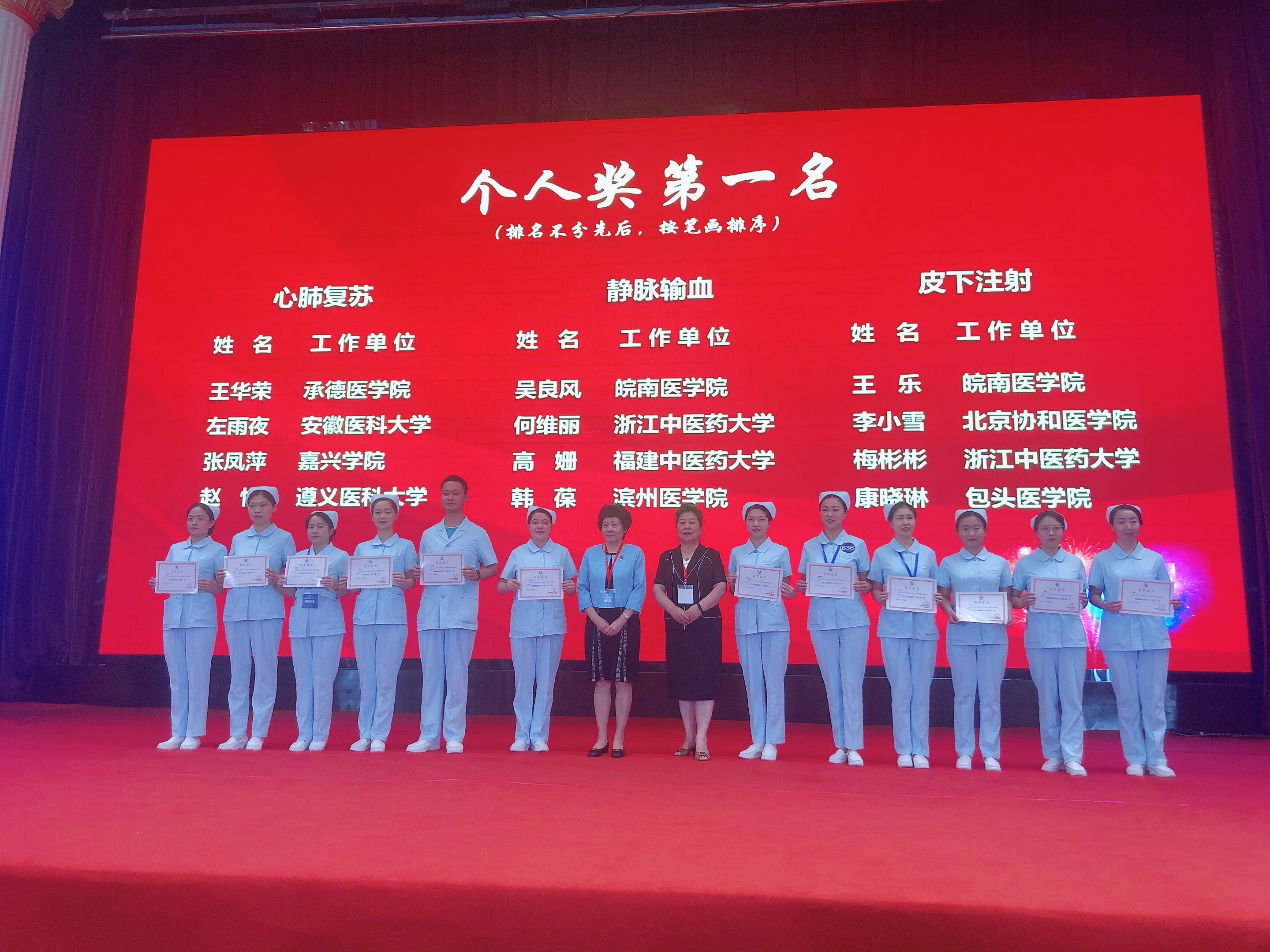 在沈勤、胡培亚老师的指导下,beat365屠乐微、梅彬彬、何维丽老师三位教师在竞赛中展现了“最美”风采。凭借精湛的临床操作技能、丰富的教学经验和扎实的专业基础,表现出色,赢得了评委和参赛同行的高度赞誉。最终从85支队伍中脱颖而出,荣获了团体奖第一名。同时,何维丽老师获得了静脉输血个人奖第一名,梅彬彬老师获得皮下注射个人奖第一名,屠乐微老师获得了CPR个人奖第三的名的优异成绩。