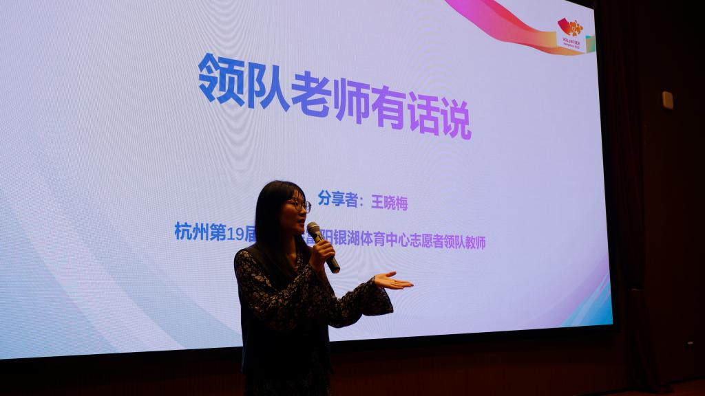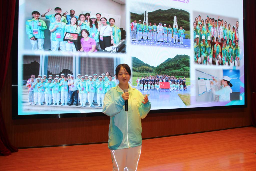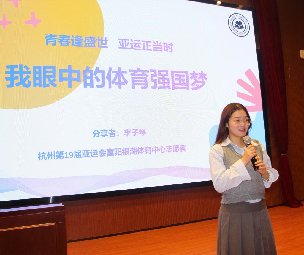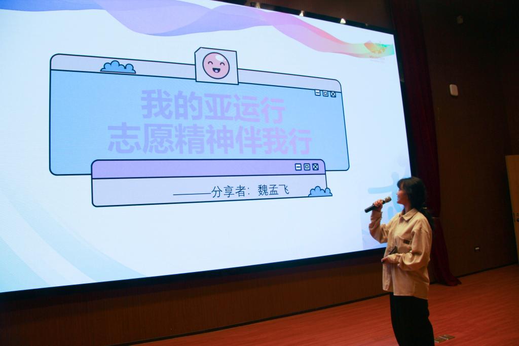 “小青荷”魏孟飞同学主分享了她在亚运服务岗位中的工作以及小青荷志愿者的日常,这段经历对她来说是值得久久回味的集体回忆。她说:“志愿服务不仅是一种行动,更是一种品质与价值观,要更主动地将亚运志愿服务精神传递出去,以志愿精神作为激励,以饱满的热情投入到学习中,投入到自我锤炼中”。“小青荷”李子琴同学则以“青春逢盛世,亚运正当时”为题,讲述了她在志愿服务赛场上看到的拼搏与努力,她切身感受到的体育强国梦。“小青荷”胡雪妍同学向我们谈述了她在担任小青荷志愿者时的经历。从开始时的生疏与不知所措,到后来的从容自信,她也不断成长与进步,承担起了志愿者的责任。