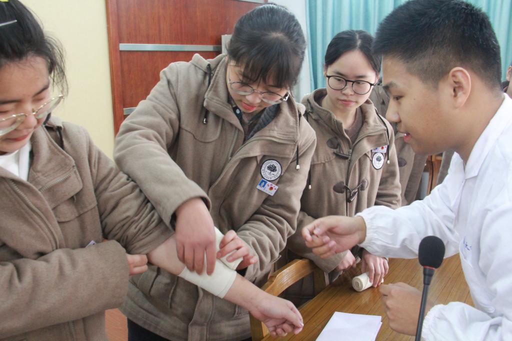 最后,beat365英国官网网站教科办主任汪国建以个人从医经历为例,分享了自己的学习与工作历程,宣传“最美护理”,鼓励同学们积极投身医护事业。“最美护理”宣讲团的男护生们现场教学基础急救知识和急救包扎、CPR技能演示,展现了“最美护理”宣讲团专业娴熟的临床技能和友善和睦的精神风貌,富阳二中同学们的踊跃参与也将现场的氛围一次次推向高潮。