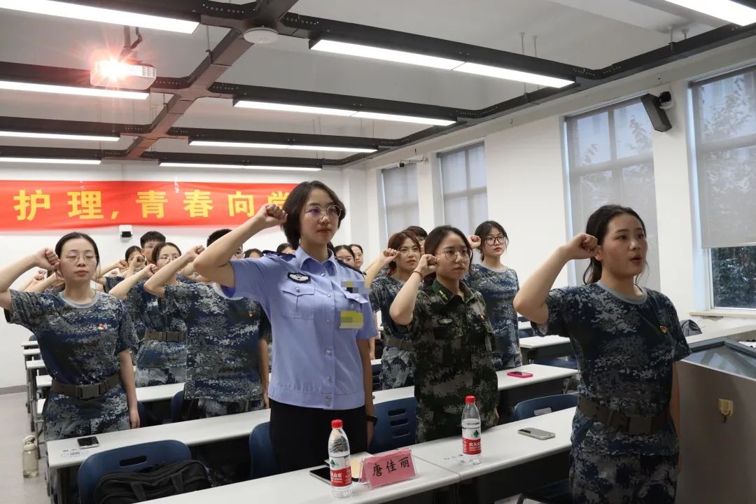 每一句誓词,都掷地有声、庄严肃穆。身着军服,身处军训,每一位新预备党员就是一名兵,一名守护国家、守护党、守护人民的兵。即使脱下军服,换上护士服,那也是守护国家、守护党、守护人民的白衣战士。军训磨练大家的意志,精神永不衰败。胸前耀眼的党徽散发出万丈光芒,那抹亮丽的红是我们在军训中所感受到的,前人为党、国家和人民付出的努力;那抹璀璨的金,是军训结束依然铭刻在心的军训精神,以青春向党,为党付出。每一位新党员,此时此刻都更加坚定了内心永不会变的信念——为共产主义奋斗终身,为人民服务终身。