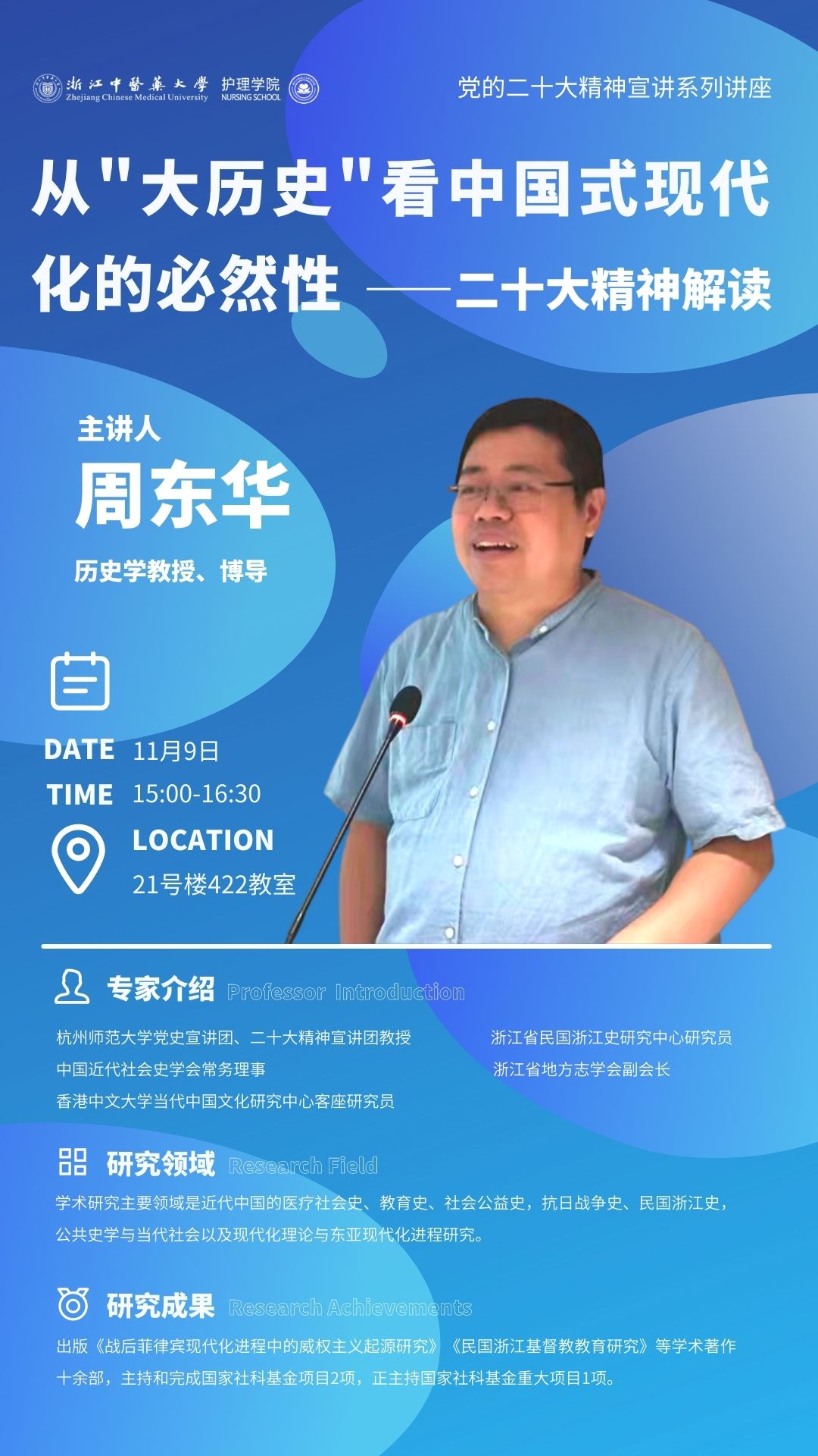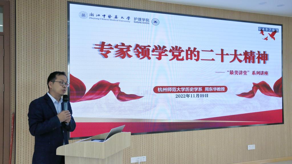 习近平总书记强调,要把学习宣传贯彻党的二十大精神这件大事抓紧抓好抓出成效。为认真学习好宣传好贯彻好党的二十大精神,牢牢把握会议精神中的核心要领,11月9日下午,beat365英国官网网站组织开展“最美大讲堂”专家领学活动,特邀浙江省民国浙江史研究中心研究员,中国近代社会史学会常务理事,浙江省地方志学会副会长,杭州师范大学历史学系周东华教授作讲座。会议由beat365英国官网网站党委书记李海滨主持,校计财处、国合处教师代表,beat365英国官网网站全体教师和学生党员代表参加。