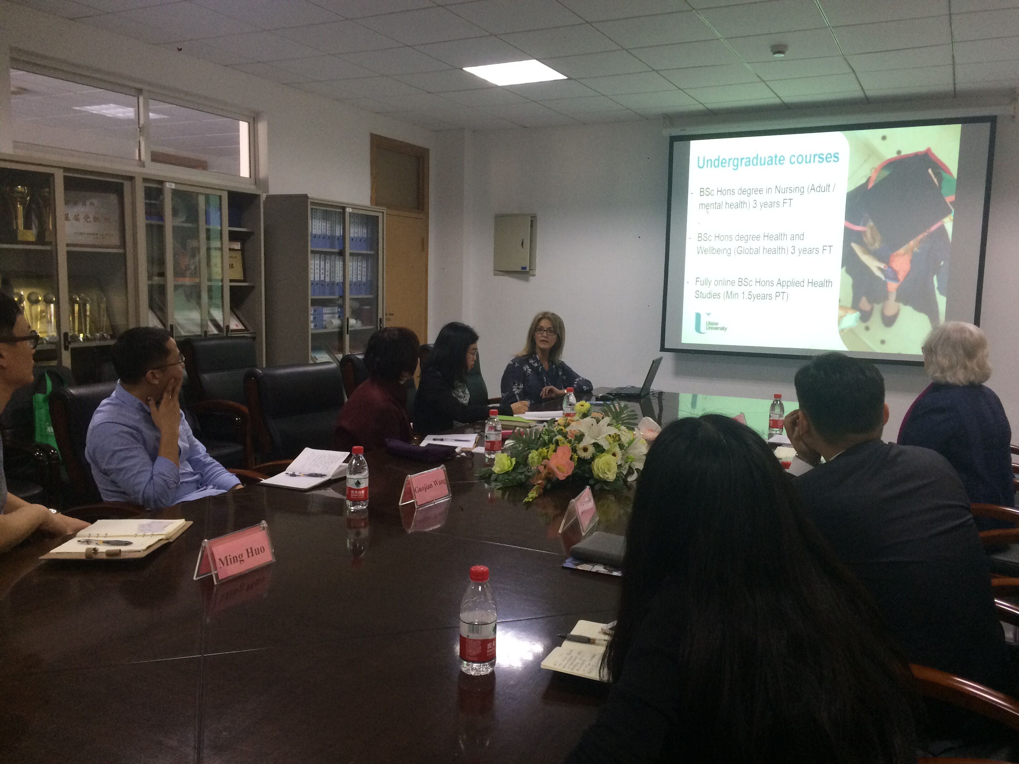 何桂娟院长向阿尔斯特大学的两位教授表示欢迎,并介绍了beat365英国官网网站的历史沿革、护理和助产专业的学科建设、师资队伍和教学条件等。随后,阿尔斯特大学的Carol教授也介绍了该校的概况,包括地理环境、专业设置和学生就业等。Donnell教授详细介绍了该校护理专业的基本情况。阿尔斯特大学,地处北爱尔兰,其护理专业目前英国排名第5,具有本科、硕士、博士三个层次。地彼此了解后,双方就可能开展的合作进行讨论,关于本科生的“2+1+1”合作模式和研究生的“1+1+1”合作模式有开展的可行性达成共识。另外,关于开展学生短期交流项目、教师科研合作和师资培训等项目也做了深入沟通和交流,双方高度认可彼此的合作基层,愿意尝试各种新的项目,以促进彼此学科和文化的交流。