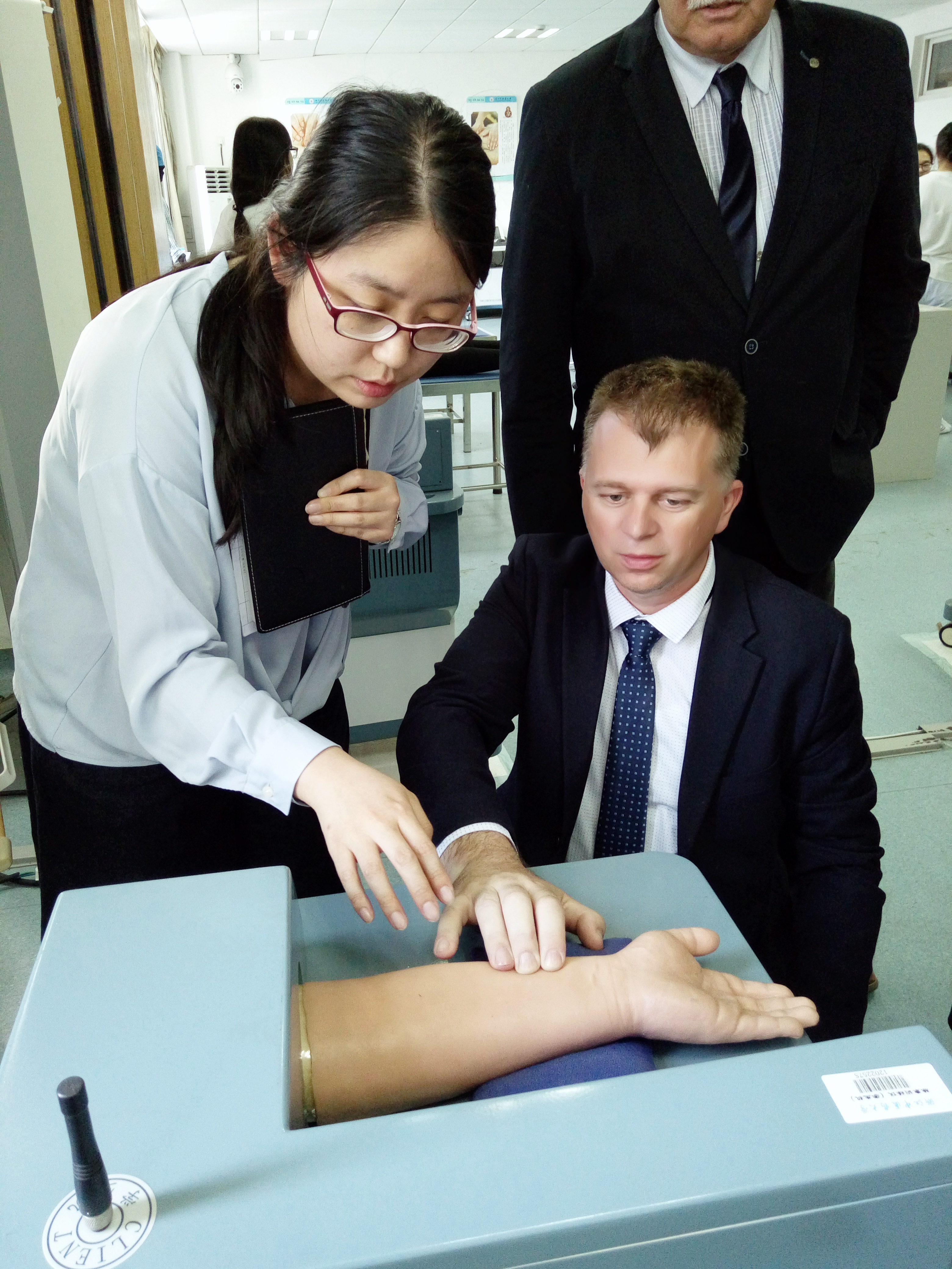 最后,捷方代表参观了beat365的实验室和模拟病房。中医护理实验室内诸多中医与护理的结合元素让他们流连忘返。Petr Konečný先生还亲自体验了一把脉诊仪和舌诊仪,beat365中医护理专业教师楼数慧全程陪同翻译,充分展现了中医护理的魅力。