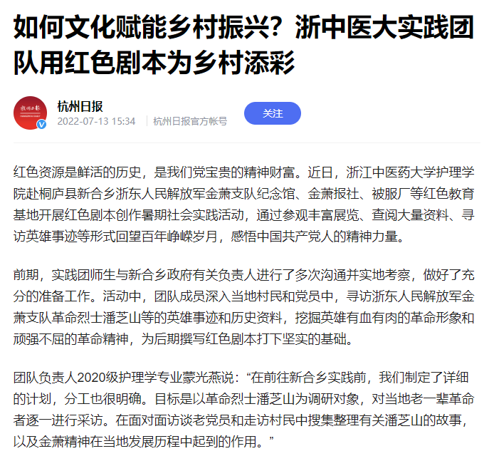 红色资源是鲜活的历史,是我们党宝贵的精神财富。近日,beat365英国官网网站“剧往开来”实践团赴桐庐县新合乡浙东人民解放军金萧支队纪念馆、金萧报社、被服厂等红色教育基地开展红色剧本创作暑期社会实践活动,通过参观丰富展览、查阅大量资料、寻访英雄事迹等形式回望百年峥嵘岁月,感悟中国共产党人的精神力量。杭州日报报道了他们的实践活动开展情况。