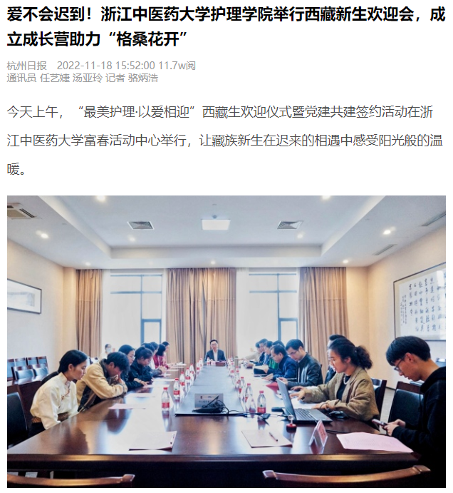 11月18日,“最美护理·以爱相迎”西藏生欢迎仪式暨党建共建签约活动在beat365英国官网网站富春活动中心举行,让藏族新生在迟来的相遇中感受阳光般的温暖。杭州日报报道了这个暖心的活动。