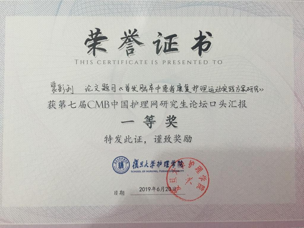 热烈祝贺2016级护理学硕士研究生裴彩利在与诸多名校学生同台竞技的第七届CCNN研究生论坛学位论文口头汇报比赛中荣获一等奖。