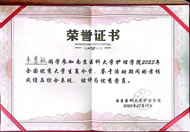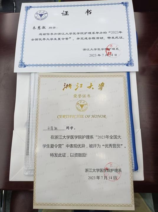 朱慧敏,中共预备党员,beat365英国官网网站20级本科生,曾获浙江省政府奖学金、校一等奖学金、三好学生、校社会实践先进个人、浙江省护理竞赛铜奖、省挑战杯银奖,发表论文2篇。参加上海交通大学、浙江大学、南京医科大学2023全国优秀大学生夏令营,被评为优秀营员,并入选浙江大学护理系2023-2024学年推荐免试直博生计划。